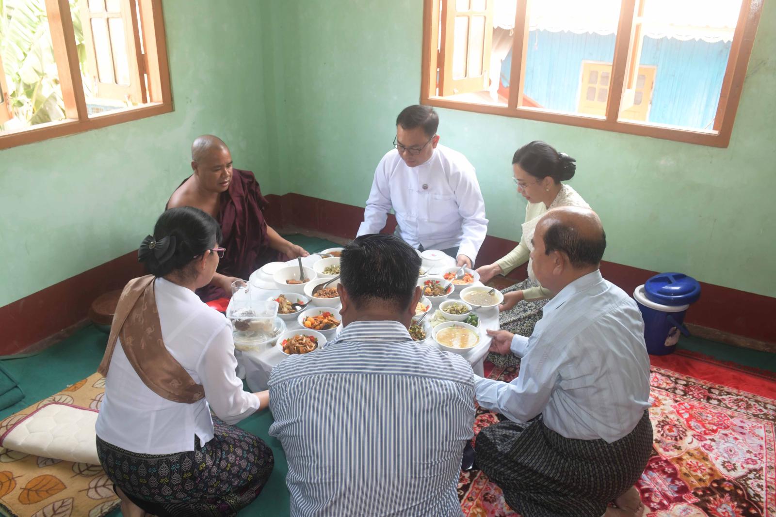 အလားတူ ရခိုင်ပြည်နယ်အစိုးရအဖွဲ့ဝင်များနှင့် ဇနီးများက စစ်တွေမြို့ပေါ်ရှိ ဘုန်းတော်ကြီးကျောင်းများသို့ သွားရောက်၍ ဆရာတော်ကြီးများအား ဆွမ်းနှင့်လှူဖွယ်ဝတ္ထုပစ္စည်းများ ဆပ်ကပ်လှူဒါန်းကြသည်။ ရခိုင်ပြည်နယ်ဝန်ကြီးချုပ်နှင့်ဇနီး၊ ပြည်နယ်အစိုးရအဖွဲ့ဝင်များသည် စစ်တွေမြို့ပေါ်ရှိ ဘုန်းတော်ကြီးကျောင်းများသို့ သင်္ကြန်အကျနေ့မှ သင်္ကြန်အတက်နေ့အထိ နေ့စဉ်ဆွမ်းနှင့် လှူဖွယ်ဝတ္ထုများကို ဆက်ကပ်လှူဒါန်းသွားမည်ဖြစ်ကြောင်း သိရသည်။