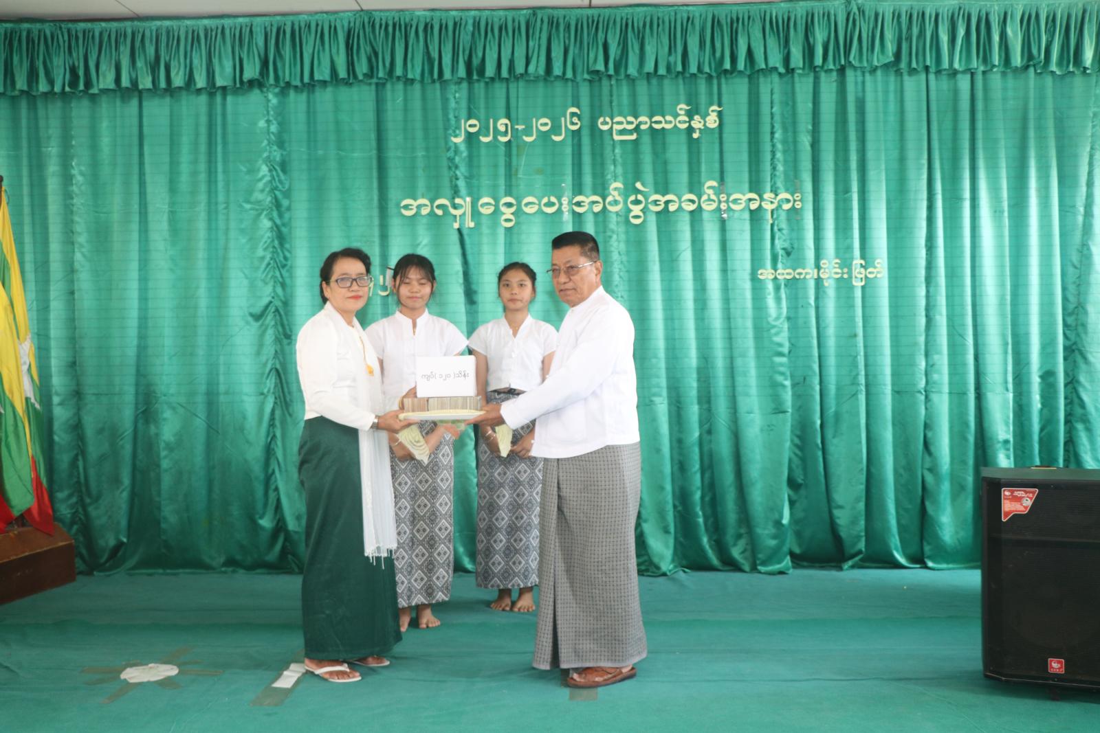 ဆက်လက်၍ ဘင်ခရာအသင်း ဖွဲ့စည်းနိုင်ရေးအတွက် အလှူရှင်ကျောင်းအကျိုးတော်ဆောင် ဂုဏ်ထူးဆောင်နာယက သုဓမ္မမဏိဇောတဓရ ဦးထွန်းရွှေက ကျပ်သိန်း (၁၂၀) အားလည်းကောင်း၊ ဒုတိယစစ်ဆင်ရေးကွပ်ကဲရေးမှူး ဗိုလ်မှူးကြီး နေဝင်းထွန်းနှင့် ဇနီးမိသားစုမှလည်းကောင်း၊ မြို့နယ်စီမံခန့်ခွဲရေးနှင့်အုပ်ချုပ်ရေးကော်မတီဥက္ကဋ္ဌ ဦးလှမျိုးကလည်းကောင်း၊ ပြည်နယ်လွှတ်တော်ကိုယ်စားလှယ် ဦးညွှန့်ဝင်းနှင့် ပြည်နယ်လွှတ်တော်ကိုယ်စားလှယ် ဦးစိုင်းရီတစ်တို့က အလှူငွေများကို ပေးအပ်လှူဒါန်းရာ ကျောင်းအုပ်ဆရာမကြီး ဒေါ်အမာကြည်က လက်ခံရယူခဲ့ကြောင်း သိရသည်။