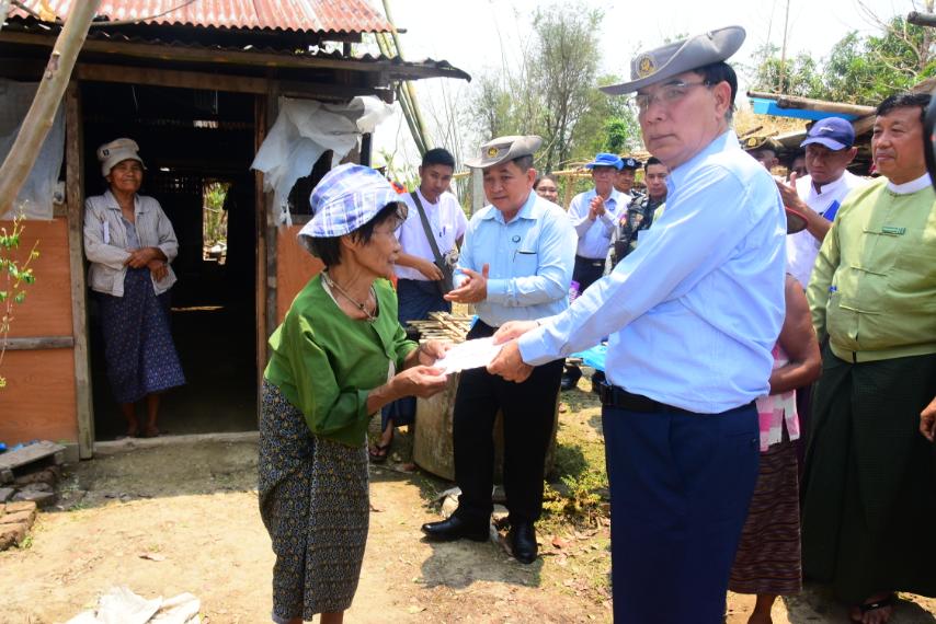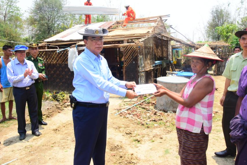 ရှေးဦးစွာ ဝန်ကြီးချုပ်မှ ဘုကြီးကျေးရွာအုပ်စု သက်ကယ်ချင်းကုန်းကျေးရွာရှိ သဘာဝဘေးအန္တရာယ်ကြောင့် အမိုးလန်ပြိုလဲပျက်စီးမှုများဖြစ်ပေါ်ခဲ့သော ဒေသခံများနေအိမ်သို့ အရောက်သွားပြီးပျက်စီးဆုံးရှုံးမှုများအတွက် အိမ်ဆောက်ပစ္စည်းဖိုး ထောက်ပံ့ငွေများပေးအပ်ခဲ့ပြီး အ.ထ.က(ကြို့ပင်ကောက်) ကျောင်းတွင် ဒေသခံအချို့နှင့် ထပ်မံ တွေ့ဆုံ၍ အိမ်ဆောက်ပစ္စည်းဖိုး ထောက်ပံ့ငွေများနှင့် အိမ်အသုံးအဆောင်ပစ္စည်းများ ပေးအပ်ခဲ့ကြောင်း သိရသည်။