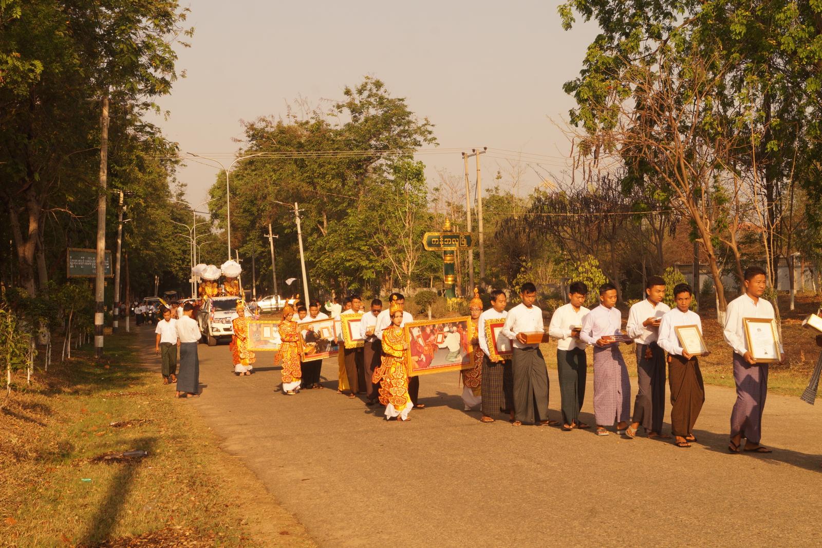 ရှေးဦးစွာ ဘွဲ့တံဆိပ်တော်ရ ဆရာတော်အား ခရိုင်စုပေါင်းရုံးမှတစ်ဆင့် တပင်ရွှေထီးလမ်း၊ ကန့်ဘလူ- ငါတို့လမ်းမှ မြို့ဦးရွာမပရိယတ္တိစာသင်တိုက်ကြီးသို့ ပင့်ဆောင်ပူဇော်ကြသည်။