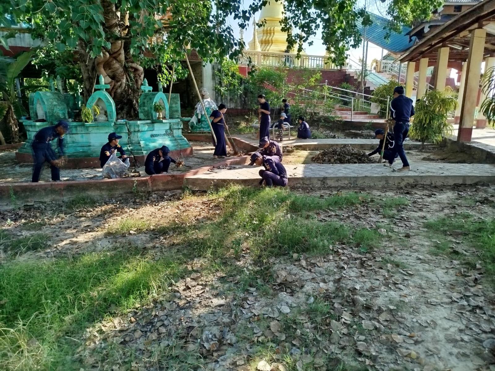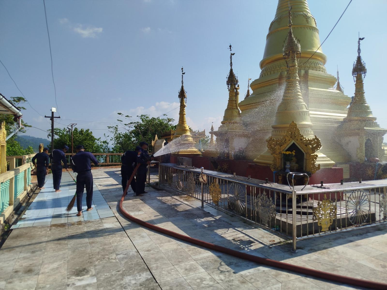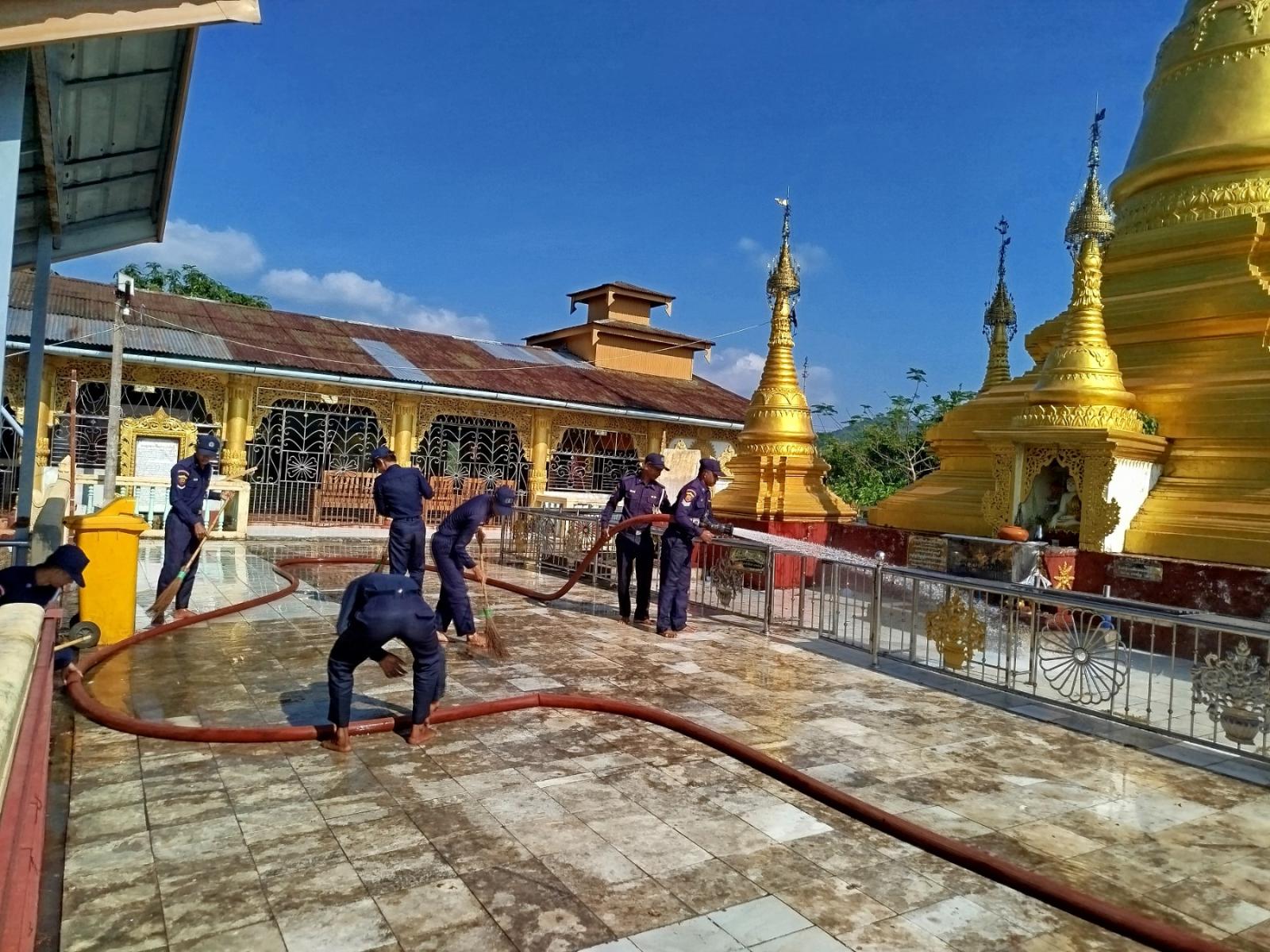 ဆောင်ရွက်ရာတွင် မြို့နယ်မီးသတ်ဦးစီးမှူး ဦးတင်ထွန်းနိုင်၏ ကြီးကြပ်မှုဖြင့် ကျွန်းစုမြို့နယ် မီးသတ်စခန်းမှ တပ်ဖွဲ့ဝင်များနှင့် စည်းထိန်းအဖွဲ့ဝင်များ စုပေါင်း၍ ဘုရားရေသပ္ပါယ်ခြင်း၊ ဘုရားပန်းကပ် လှူဒါန်းခြင်းနှင့် စုပေါင်းသန့်ရှင်းရေးလုပ်ငန်းများအား ဆောင်ရွက်ခဲ့ကြောင်း သိရသည်။