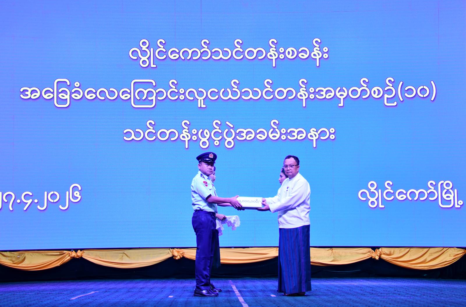 ဆက်လက်၍ ပြည်နယ်ဝန်ကြီးချုပ်က အခြေခံလေကြောင်းလူငယ်သင်တန်း အမှတ်စဉ် (၁၀) အတွက် ချီးမြင့်ငွေများ ပေးအပ်ရာ သင်တန်းတာဝန်ခံအရာရှိက လက်ခံရယူခဲ့သည်။ ထို့နောက် ပြည်နယ်ဝန်ကြီးချုပ်နှင့် တာဝန်ရှိသူများက သင်တန်းသား၊ သင်တန်းသူများနှင့် စုပေါင်းမှတ်တမ်းဓာတ်ပုံရိုက်ကူးပြီး သင်တန်းသား၊ သင်တန်းသူများအား ရင်းရင်းနှီးနှီး နှုတ်ဆက်အားပေးစကားပြောကြားကာ ခင်းကျင်းပြသထားသည့် သင်ထောက်ကူပစ္စည်းများ လှည့်လည်ကြည့်ရှုအားပေးသည်။