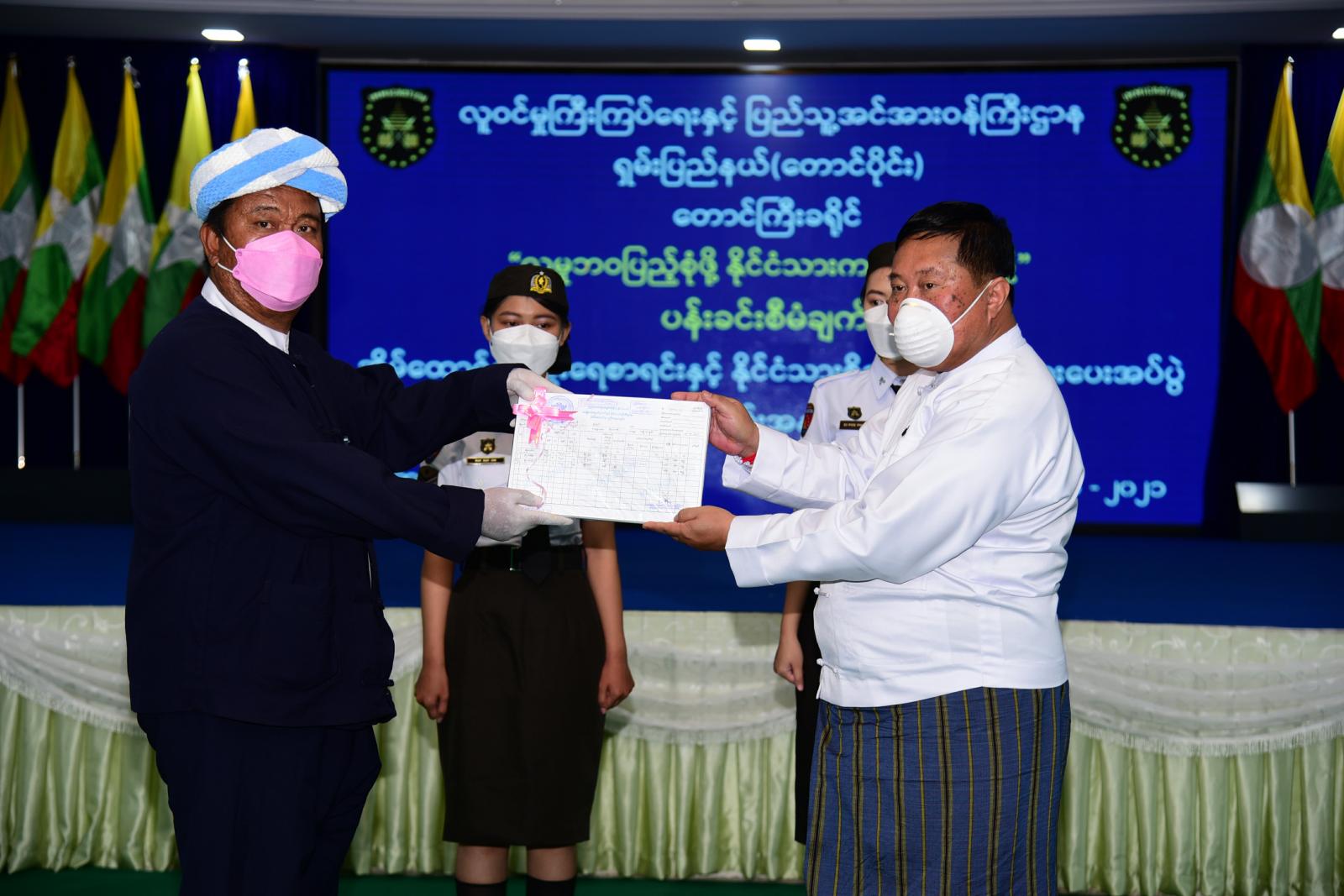 ရှမ်းပြည်နယ်အစိုးရအဖွဲ့ ပြည်နယ်ဝန်ကြီးချုပ် ဒေါက်တာကျော်ထွန်းက မြန်မာနိုင်ငံအတွင်း နေထိုင်ကြ သော တိုင်းရင်းသားများ နှင့် ဥပဒေအရ နိုင်ငံသားများအား ဥပဒေနှင့်အညီ အိမ်ထောင်စုလူဦးရေစာရင်းနှင့် ကိုင်ဆောင်သင့်သည့် ကတ်ပြားတစ်မျိုးမျိုး ထုတ်ပေးနိုင်ရေးအတွက် လူဝင်မှုကြီးကြပ်ရေးနှင့် ပြည်သူ့အင်အားဝန်ကြီးဌာနမှ “ပန်းခင်း” ဟူသော စီမံချက်နှင့် ၂၀၂၁ ခုနှစ် မေလ(၃)ရက်မှ စတင်ပြီး တစ်နိုင်ငံလုံးတွင် ဆောင်ရွက်ပေးလျက်ရှိပါကြောင်း၊ ကိုင်ဆောင်သင့်သည့် ကတ်ပြားတစ်မျိုးမျိုး ထုတ်ပေး ဆောင်ရွက်ရာတွင် လွယ်ကူလျင်မြန်စေရန် ဥပဒေနှင့်အညီ တတ်နိုင်သမျှ ဖြေလျော့ပြီး “ပန်းခင်း” စီမံချက်နှင့် ဆောင်ရွက်ပေးလျက်ရှိရာ ပြည်သူများအနေဖြင့် တောင်ကြီးမြို့နယ်ရုံးကို လာရောက်ဆောင်ရွက်ရသည့် ကိစ္စတစ်ခုကို အဆင်ပြေချောမွေ့စွာဖြင့် ငွေကြေးကုန်ကျမှုသက်သာပြီး ကိုယ့်ဒေသတွင် လုပ်ငန်းခွင် အလုပ်အကိုင်မပျက် နိုင်ငံသား စိစစ်ရေး ကတ်ပြားများရရှိသည့်အတွက် ဝမ်းသာစရာဖြစ်ပါကြောင်း၊ နိုင်ငံသားစိစစ်ရေး ကတ်ပြားရရှိသည့် မြန်မာနိုင်ငံသားများကလည်း နိုင်ငံသားအခွင့်အရေးကို အပြည့်အဝ ရရှိခံစားနိုင်မှာဖြစ်ပြီး နိုင်ငံသားတစ်ယောက်၏ တာဝန်နှင့် နိုင်ငံအပေါ် သစ္စာ စောင့်သိရန်လည်း လိုအပ်ပါကြောင်း၊ ရရှိပြီးသည့် အိမ်ထောင်စုလူဦးရေစာရင်းနှင့် နိုင်ငံသားစိစစ်ရေးကတ်ပြားများကို စနစ်တကျ ကိုင်တွယ်ထိန်းသိမ်းကြရန် ပြောကြားသည်။