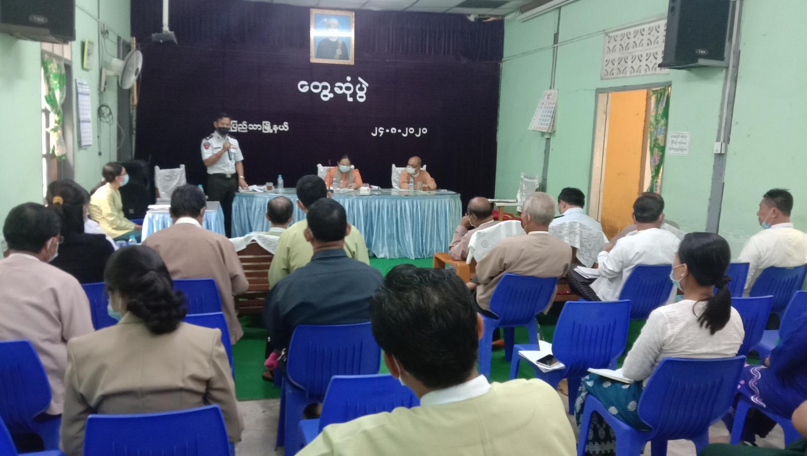 ၂၀၂၀ ပြည့်နှစ် အထွေထွေရွေးကောက်ပွဲတွင် မဲစာရင်များ ပြည့်စုံမှန်ကန်ရေးနှင့် လွတ်လပ်သော ၍တရားမျှတသော ရွေးကောက်ပွဲ အောင်မြင်စွာ ကျင်းပနိုင်ရေးတို့အတွက် ရန်ကုန်တိုင်းဒေသကြီးအစိုးရအဖွဲ့ လူဝင်မှုကြီးကြပ်ရေးနှင့် လူ့စွမ်း အားအရင်းအမြစ် ဝန်ကြီး ဒေါ်မိုးမိုးစုကြည် ဦးဆောင်သော ရန်ကုန်တိုင်းဒေသကြီး မဲဆန္ဒရှင်စာရှင်းများ ပြည့်စုံမှန်ကန်ရေး ပံ့ပိုးကူညီးပေးရေးအဖွဲ့နှင့် ရွှေပြည်သာ မြို့နယ် ရွေးကောက်ပွဲကော်မရှင်အဖွဲ့ခွဲ အဖွဲ့ဝင်များနှင့် တွေ့ဆုံညှိနှိုင်း အစည်း အဝေးကို ယမန်နေ့ ညနေ (၃)နာရီ အချိန်တွင် ရွှေပြည်သာမြို့နယ် အထွေထွေအုပ်ချုပ်ရေး အစည်းဝေးခန်းမ၌ ကျင်းပခဲ့ သည်။