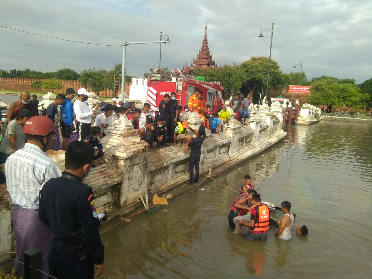 ကျုံးရေပြင်ထဲသို့ ပြုတ်ကျသည့်ယာဉ်အား အောင်မြေသာစံမြို့နယ် မီးသတ်ဦးစီးဌာနမှ ဦးစီးမှူး ဦးမြင့်ခိုင်ဦးစီး၍ မီးသတ်တပ်ဖွဲ့ဝင်များ၊ နန်းတော်ရှေ့ လူမှုကယ်ဆယ်ရေးအသင်းနှင့် စေတနာမေတ္တာလူမှုရေးအသင်းတို့မှ အဖွဲ့ဝင်များပူးပေါင်း၍ ကယ်ဆယ်ရေးလုပ်ငန်းများဆောင်ရွက်ကြရာ နံနက် (၇) နာရီ (၂၀) တွင် ယာဉ်မောင်း မောင်----အားဆယ်ယူရရှိပြီး မန္တလေးအထွေထွေရောဂါကုဆေးရုံကြီးသို့ နန်းတော်ရှေ့လူမှုကူညီရေးအသင်းယာဉ်ဖြင့် ပို့ဆောင်ပေးခဲ့ရာ နံနက် ၇ နာရီခွဲအချိန်တွင်ရောက်ရှိ၍ တာဝန်ကျဆရာဝန် ဒေါက်တာနေဝင်းအောင်မှ လက်ခံစစ်ဆေးခဲ့ပြီး စစ်ဆေးချိန်တွင် သေဆုံးနေပြီဖြစ်ကြောင်း သိရသည်။