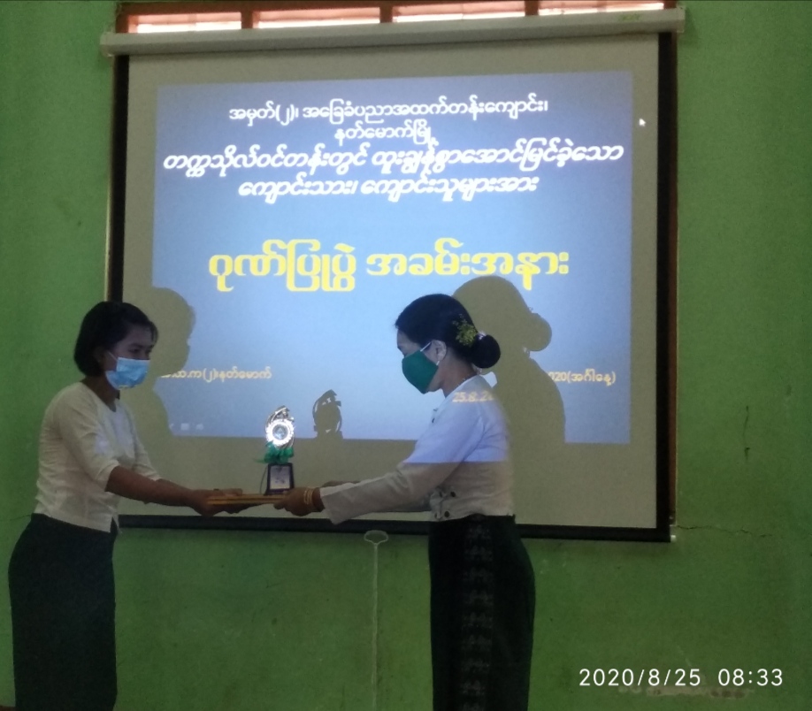နတ်မောက်မြို့အမှတ် (၂) အခြေခံပညာအထက်တန်းကျောင်း၌ ၂၀၁၉-၂၀၂၀ တက္ကသိုလ်ဝင်တန်းစာမေးပွဲတွင် ဂုဏ်ထူးရ ကျောင်းသား/သူများဖြစ်သည့် (၄)ဘာသာဂုဏ်ထူးရှင် (၂)ဦး၊ (၃)ဘာသာ ဂုဏ်ထူးရှင် (၁)ဦး၊ (၂) ဘာသာ ဂုဏ်ထူရှင် (၄)ဦး၊ (၁)ဘာသာဂုဏ်ထူးရှင် (၄)ဦးစုစုပေါင်း (၁၁)ဦးနှင့် ဘောဂဗေဒဘာသာတွဲတွင် မကွေးတိုင်းအဆင့် နံပါတ် (၅) ရရှိသူ(၁)ဦးတို့အား ကျောင်းရှိ ဆရာ၊ဆရာမများနှင့် ကျောင်းအကျိုးတော်ဆောင် ဦးဉာဏ်ရှိန် တို့က ဂုဏ်ပြုမှတ်တမ်းလွှာများ အသီးသီးပေး အပ်ခဲ့ ကြောင်းသိရသည်။