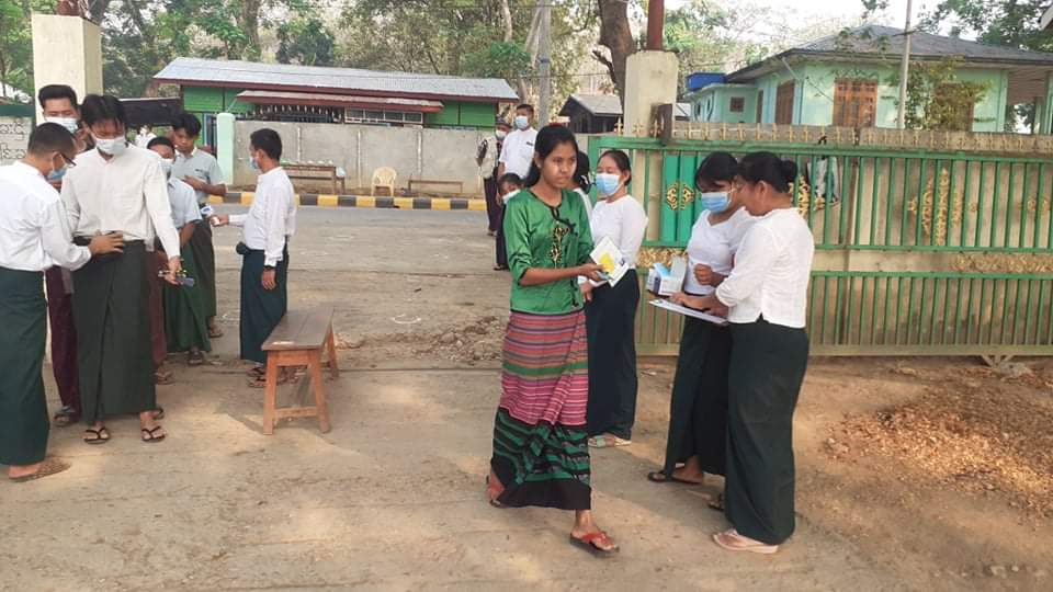 တက္ကသိုလ်ဝင်တန်းစာမေးပွဲ ဝင်ရောက်ဖြေဆိုကြသည့် ကျောင်းသား၊ ကျောင်းသူများအား ကိုဗစ်-၁၉ ရောဂါ ကြိုတင်ကာကွယ်ရေး စည်းကမ်းချက်များနှင့်အညီ စာဖြေခန်းတွင်းသို့ မဝင်ရောက်မီ ကိုယ်အပူချိန်တိုင်းတာခြင်းနှင့် ကျန်းမာရေးစစ်ဆေးခြင်းများကို ဆောင်ရွက်ပေးလျက် ရှိကြောင်း သိရသည်။