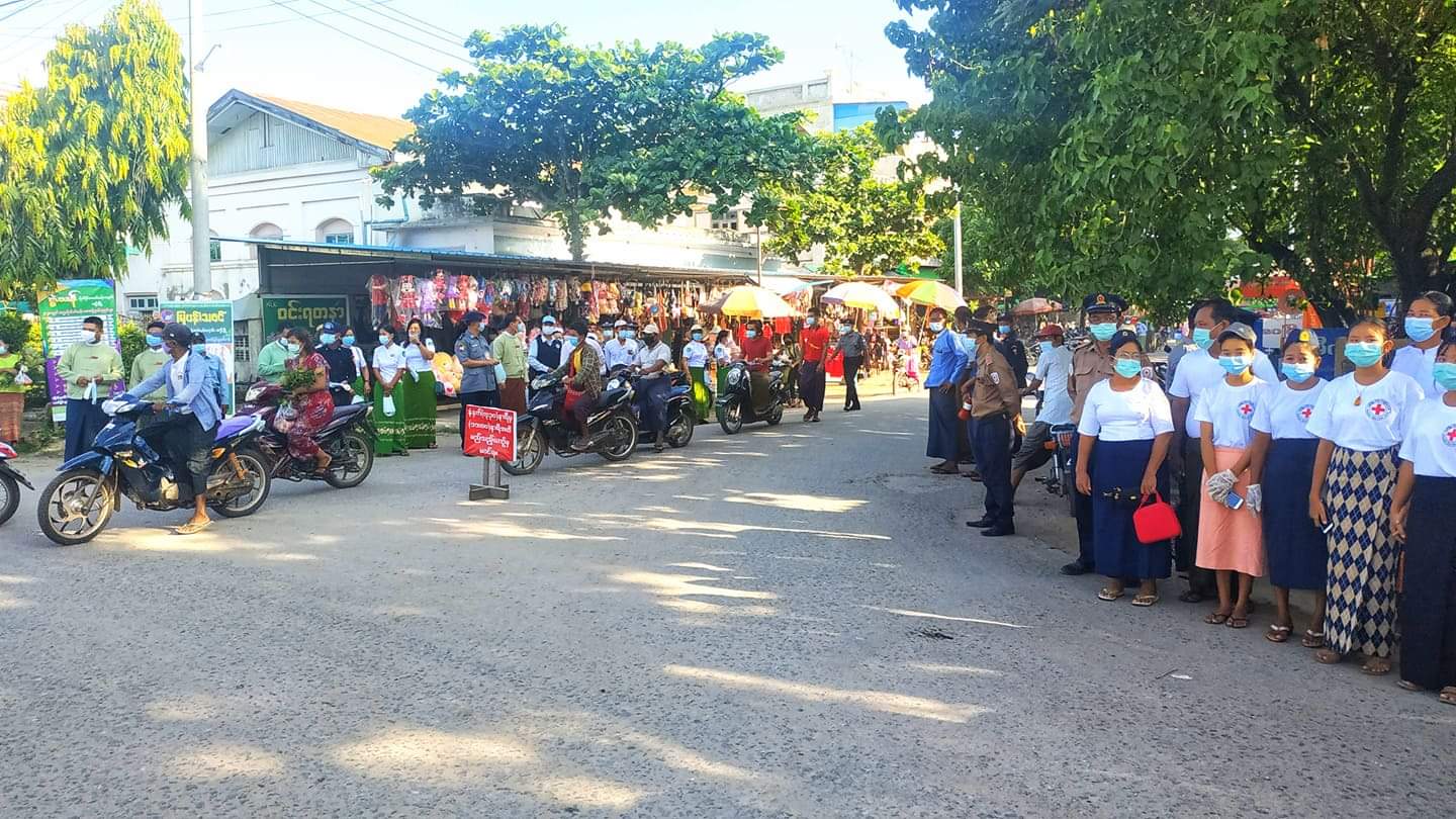 Mask Campaign ပြုလုပ်ခြင်းကို ပြည်သု့လွှတ်တော်ကိုယ်စားလှယ် ဒေါက်တာ မင်းသိန်း၊ မြို့နယ်စီမံခန့်ခွဲမှု ကော်မတီဥက္ကဋ္ဌ ဦးခင်မောင်မြင့်၊ မြို့နယ်ရဲတပ်ဖွဲ့မှူး ရဲမှုးညွန့်၀င်း၊ စည်ပင် သာယာရေး ကော်မတီဥက္ကဋ္ဌ ဦးကျော်ညွန့်ဆွေ တို့ဦးဆောင်မှုနှင့်အတူ မီးသတ်တပ်ဖွဲ့၊ စည်ပင်သာယာရေးဌာန၊ ရဲတပ်ဖွဲ့၊ ကျန်းမာရေးဌာန ၀န်ထမ်းများ၊ မြို့နယ်ကြက်ခြေနီ အသင်းတို့ပူးပေါင်းပါ၀င်လျက် လမ်းသွားလမ်းလာ ပြည်သူ ၃၀၀ ဦးအား mask များ အသီးသီး ဝေပေးခဲ့ကြပြီး နေအိမ်ပြင်ပ ထွက်လျှင် Mask တပ်ဆင်ခြင်းဖြင့် ပြည်သူများမှ ပူးပေါင်းပါဝင် လုပ်ဆောင်ပေးကြရန်လိုအပ်ကြောင်း၊ ကူးစက်ရောဂါ ထိန်းချုပ်ရေးဆိုင်ရာ အသိပညာပေး ထုတ်ပြန် ကြေညာ ချက်များကို လိုက်နာခြင်းဖြင့် အတူပူးပေါင်း ပါ၀င်ဆောင်ရွက်မှသာ ထိန်းချုပ် နိုင်မည်ဖြစ်ကြောင်းကို သိပညာပေးပြောကြားခြင်းများ ဆောင်ရွက်ခဲ့ကြ ကြောင်း သိရသည်။