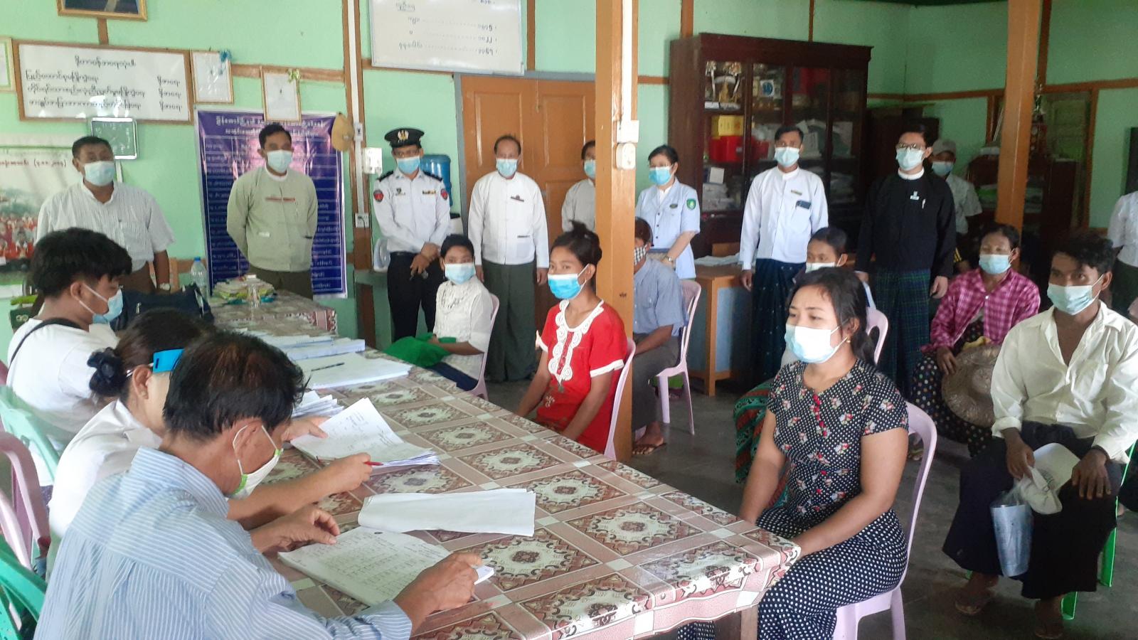 သစ္စာစီမံချက်ဖြင့် မဲစာရင်းအမည်ပါ နိုင်ငံသားစိစစ်ရေးကတ်ပြား နံပတ်များဖြည့်သွင်းပေးခြင်းနှင့် နိုင်ငံသားစိစစ်ရေး ကတ်ပြား မရှိသူ များအား ဆောင်ရွက်ပေးမှုအား မြို့နယ်ရွေးကောက်ပွဲကော်မရှင်အဖွဲ့ခွဲ ဥက္ကဋ္ဌ ဦးစိန်လှိုင်နှင့်အဖွဲ့ဝင် ဒုမြို့နယ်အုပ်ချုပ်ရေးမှူး ဦးဇော်ထက် ဦးဆောင်သော မြို့နယ်ရွေးကောက်ပွဲ ကော်မရှင် အဖွဲ့ခွဲ အဖွဲ့ဝင်များက ကြည့်ရှုစစ်ဆေးခဲ့ကြသည်။