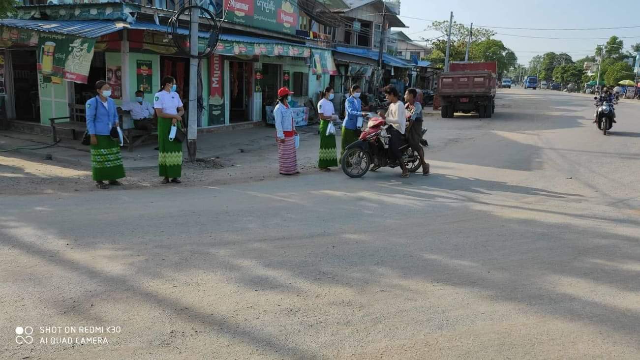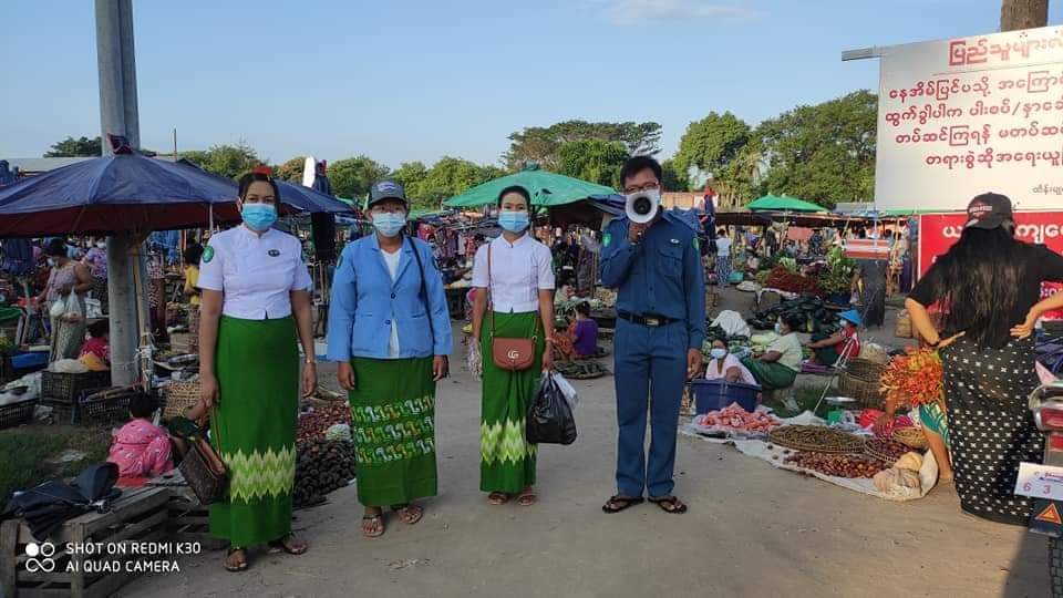 ပါးစပ်၊ နှာခေါင်းစည်း ဖြန့်ဝေရာတွင် မြို့နယ်စည်ပင်သာယာရေးက အမှုဆောင်အရာရှိ ဒေါ်မာမာအောင်နှင့် ဝန်ထမ်းများက မြို့မဈေး၊ ယာယီပျံကျဈေးနှင့် လမ်းဆုံနေရာတွင် ကိုဗစ်-၁၉ ကြိုတင်ကာကွယ်ရေး လမ်းညွှန်ချက်များအား Hand Speaker ဖြင့် အသိပေးကြေညာခြင်း၊ ဈေးသည်နှင့် ဈေးဝယ်များအား ကိုယ်အပူချိန် တိုင်းတာပေးခြင်းများ ဆောင်ရွက်ခဲ့ပြီး ဈေးရောင်း သူများ အား ပါးစပ်၊ နှာခေါင်းစည်းတပ်ဆင်ရောင်းချခြင်းမရှိပါသူများကိုငွေဒဏ်ရိုက်ခဲ့ရာ စက်တင်ဘာလ ၄ ရက်နေ့အထိ (၃၄) ဦး ရှိပြီ ဖြစ်ကြောင်းသိရသည်။