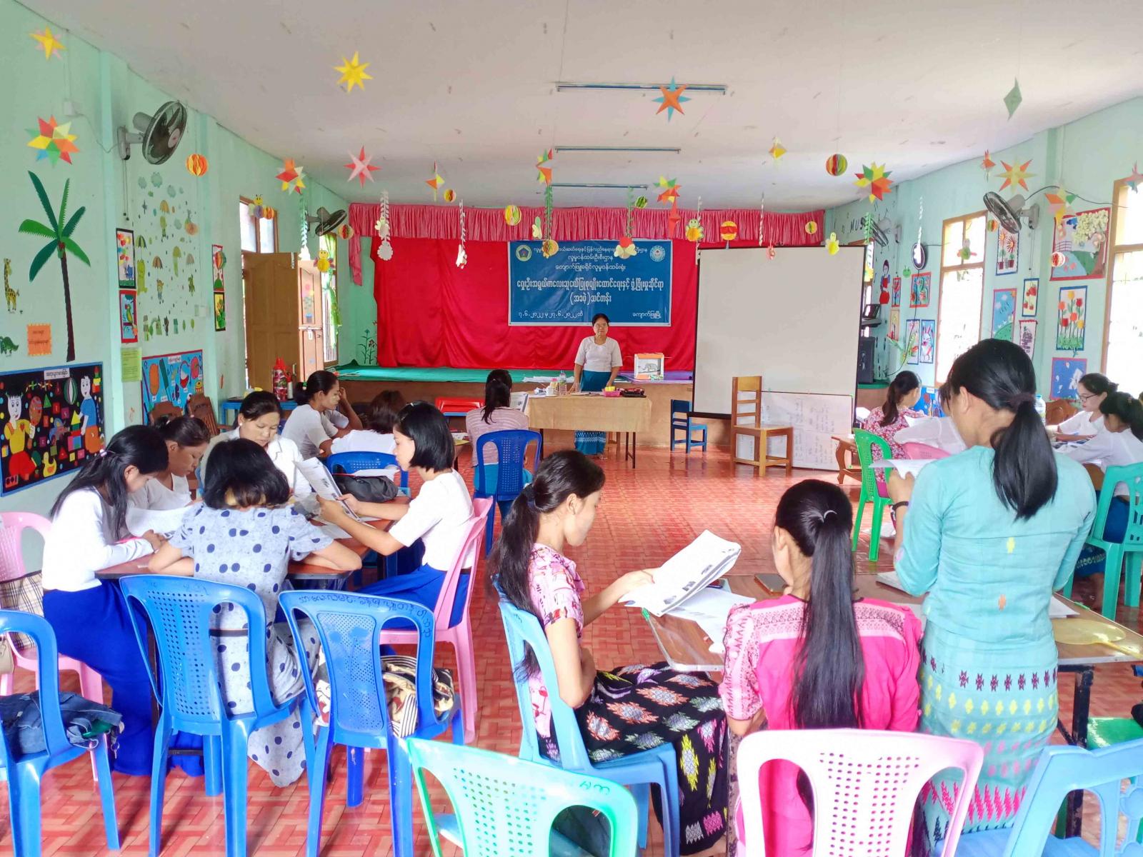 အဆိုပါသင်တန်းကို အစိုးရမူကြိုကျောင်းမှ ဆရာ၊ ဆရာမများ၊ ကိုယ့်အားကိုယ်ကိုး မူလတန်းကြို ကျောင်းမှ ဆရာ၊ ဆရာများ၊ အလယ်ပိုင်းရပ်ကွက်မူကြို၊ အမှတ်(၁၈)ရေတပ်မူကြို၊ မာန်အောင်မူကြိုကျောင်းမှ ဆရာ၊ ဆရာမများ၊ မိခင်ဝိုင်းခေါင်းဆောင်များ၊ မြို့ပေါ်ရပ်ကွက်များမှ ပြုစုစောင့်ရှောက်ခြင်းကို စိတ်ပါဝင်စားသူများ တက်ရောက်သင်ယူလျက်ရှိပြိး သင်ကြားသည့် ဘာသာရပ်များမှာ ကလေးသူငယ်ဖွံ့ဖြိုးမှုဆိုင်ရာ ဘာသာရပ်များနှင့် ကလေးသူငယ်ပြုစု စောင့်ရှောက်ခြင်း အခြေခံအုတ်မြစ်များ၊ ရှေးဦးပြုစုခြင်း၊ ကလေးစိတ်ပညာ၊ ကျန်းမာရေးနှင့် အာဟာရ စသည့်ဘာသာရပ်များကို ဇွန်လ (၇) ရက် နေ့မှ (၂၇) ရက်နေ့အထိ (၃)ပတ်ကြာ စာတွေ့လက်တွေ့ပို့ချလျက်ရှိကြောင်း သိရသည်။