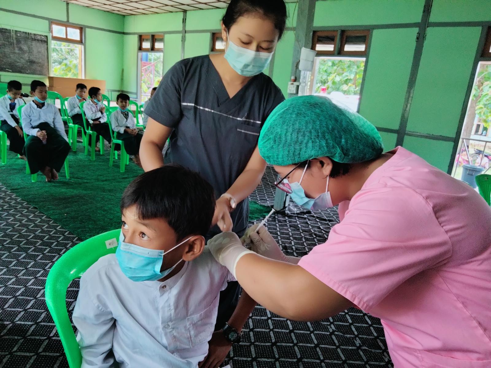 ထိုသို့ ကာကွယ်ဆေးထိုးနှံရာတွင် မြို့နယ်ကျန်းမာရေးဌာနမှ အထက်တန်းသူနာပြု ဆရာမဒေါ်နန်းဝင်းကြည် ဦးဆောင်၍ ကျန်းမာရေးဆရာမများနှင့် ကျန်းမာရေးဝန်ထမ်းများ၊ အထွေထွေအုပ်ချုပ်ရေးဦးစီးဌာနဝန်ထမ်းများ၊ ဆရာ/ဆရာမများ ပူးပေါင်း၍ အသက် ၅ နှစ်မှ ၁၂ နှစ်အထိ ကျောင်းသား၊ ကျောင်းသူများ၊ အသက် ၁၂ နှစ်မှ ၁၈ နှစ်အထိ ကျောင်းသား၊ ကျောင်းသူများအား ကိုဗစ်-၁၉ ကာကွယ်ဆေး Sinopharm ကို ထိုးနှံပေးခဲ့သည်။
