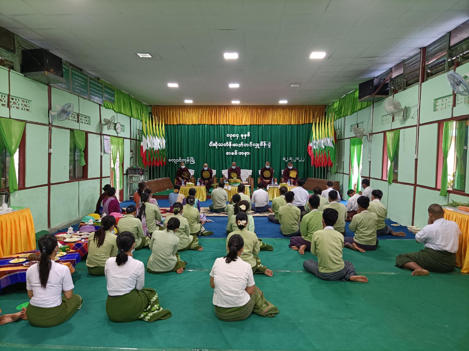 အခမ်းအနားကို နမောတဿ သုံးကြိမ်ရွတ်ဆို ဘုရားကန်တော့၍ ဖွင့်လှစ်ပြီး၊ မိုဃ်းကောင်း ပရိယတ္တိစာသင်တိုက်ကြီး၏ ပဓာနနာယကဆရာတော် ဘဒ္ဒန္တလာဘထံက ကိုးပါးသီလ ခံယူဆောက်တည်ခဲ့ကြသည်။ ဆရာတော် သံဃာတော်များက ပရိတ်တရားတော်များ ချီးမြှင့်ပြီး၊ ဝါဆိုသင်္ကန်းနှင့်လှူဘွယ်ဝတ္ထုအစုစုတို့ကို ဆက်ကပ်လှူဒါန်းခဲ့ကြသည်။