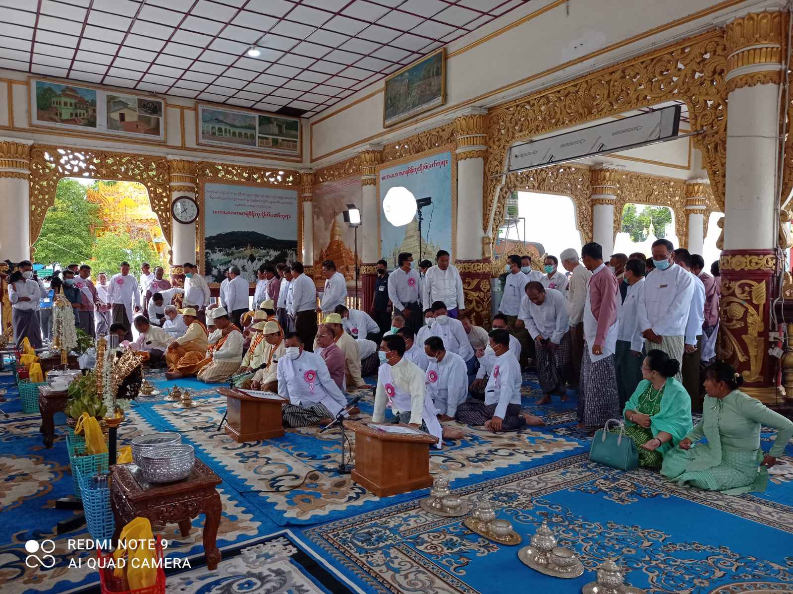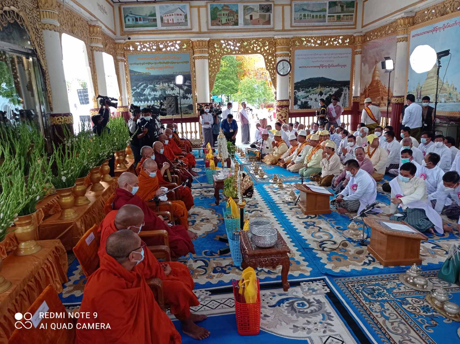 အခမ်းအနားကို“နမောတဿ” သုံးကြိမ် ရွတ်ဆိုဖွင့်လှစ်ခဲ့ကြပြီး၊ ဆရာတော် အဂ္ဂမဟာ ပဏ္ဍိတ ဘဒ္ဒန္တကေသဝထံမှ ကိုးပါးသီ လခံယူဆောက်တည်၍ ပရိတ်ချည်၊ ပရိတ်ရေ၊ ပရိတ်သဲ၊ ပရိတ်ပန်းတို့ကို ဥပါသကာများက ဆရာတော်/သံဃာတော်အရှင်သူမြတ်တို့ထံသို့ ဆက်ကပ်အပ်နှံပြီး ဆရာတော်၊သံဃာတော်အရှင်သူမြတ်တို့ ရွတ်ပွားသရဇ္ဈယ်တော်မူသော ပရိတ်တရား တော်မြတ်ကိုခံယူကြည်ညိုခြင်း၊ ဥပါသကာများက ပရိတ်ချည်၊ ပရိတ်ရေ၊ ပရိတ်သဲ၊ ပရိတ်ပန်း တို့ကိုယူဆောင်၍ စေတီတော်မြတ်ကြီး၏ ပရဝုဏ်အားပက်ဖျန်းချည်နှောင်တားဆီးကာ ရံခဲ့ကြ သည်၊၊ဆက်လက်၍ ဝန်ကြီးချုပ်ဝဏ္ဏကျော်ထင် ဦးမောင်ကိုက သာသနာရေးဆိုင်ရာများ လျှောက်ထားပြီးဝန်ကြီးချုပ်နှင့် တာဝန်ရှိသူတို့က စိန်ဖူးတော်၊ ငှက်မြတ်နားတော်တို့အား ဆရာတော်သံဃာတော်အရှင်သူမြတ်များအား ဆက်ကပ်အပ်နှင်းခြင်းနှင့် လှူဖွယ်ပစ္စည်းများ ဆက်ကပ်လှူဒါန်းခဲ့ကြရာလှူဒါန်းမှုတို့အတွက် ဆရာတော်အဂ္ဂမ ဟာပဏ္ဍိတ ဘဒ္ဒန္တ တိက္ခိန္ဒြိ ဘိဝံသက အနုမောဒနာနှင့် ရေစက်သွန်းချတရားနာယူကြည်ညိုကာသာဓု(၃)ကြိမ်ခေါ်ပြီး နောက် ခရုသင်းအဖွဲ့မှ ခရုသင်း(၃) ကြိမ်မှုတ်ပူဇော်၍ ဂေါပကအဖွဲ့ဥက္ကဋ္ဌမှ စေတီတော်မြတ်ကြီး အား လုံးတော်ပြည့်ရွှေသင်္ကန်းကပ်လှူခြင်း၊ ဘက်စုံပြုပြင်မွမ်းမံခြင်း၊ ရတနာစိန်ဖူးတော်၊ ငှက်မြတ်နားတော်တင်လှူပူဇော်ရာတွင် အမှားအယွင်းများရှိပါက ခွင့်လွှတ်ပါရန်တောင်းပန် လျှောက်ထားခဲ့ပြီး ဝန်ကြီးချုပ်နှင့်တိုင်းမှူးတို့က နတ်ဒေဝါများခြံရံကာစိန်ဖူးတော်၊ ငှက်မြတ်နားတော်တို့ကိုပင့်ဆောင်လျှက် စေတီတော်မြတ်ကြီးအား လကျာ်ရစ်လှည့် လည်ပူဇော်ကာ မင်္ဂလာရထားပျံရှိရာသို့ ပင့်ဆောင်ခြင်း၊ စိန်ဖူးတော်၊ ငှက်မြတ်နားတော်တို့ကို ဝန်ကြီးချုပ်၊ တိုင်းမှူးနှင့် တာဝန်ရှိသူများက အမွှေးနံ့သာရေများဖြင့် ပက်ဖျန်းပူဇော်ခဲ့ပြီးနောက် မင်္ဂလာ အချိန်အခါကျရောက်သည်နှင့်တစ်ပြိုင်နက် “မင်္ဂလာအခါတော်” ဟုဟစ်ကြွေးလျှက် စိန်ဖူးတော်၊ ငှက် မြတ်နားတော်တို့ကို အစီအစဉ် အတိုင်းတင်လှူပူဇော်ခဲ့ကြောင်း၊ ၎င်းနောက် အောင်မြင်ခြင်းအထိမ်းအမှတ်အနေဖြင့် ရတနာရွှေမိုး၊ ငွေမိုးရွာသွန်းခြင်း၍ အခမ်းအနားအား ဗုဒ္ဓသာသနံ စိရံတိဌတု(၃)ကြိမ်ရွတ်ဆိုကာပြီးဆုံးခဲ့ကြောင်းသိရသည်။