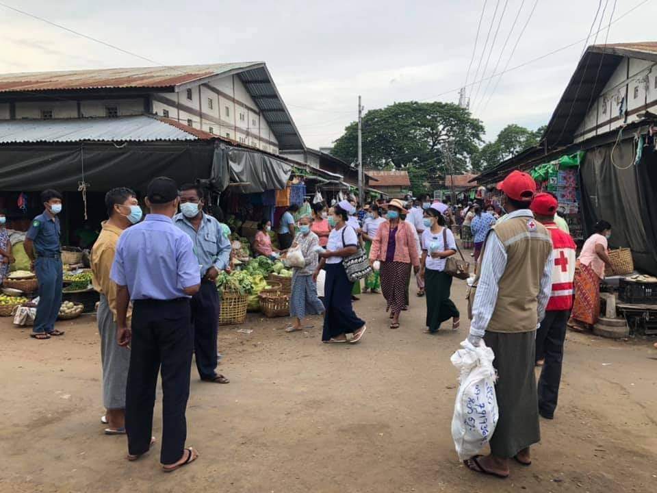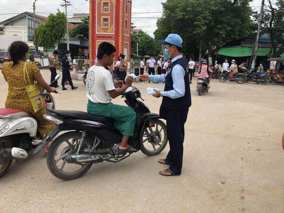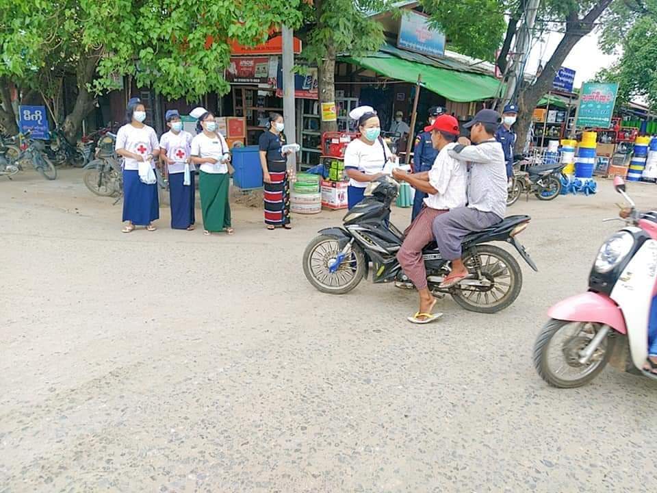 ထိုသို့ဆောင်ရွက်ရာတွင် မြို့နယ်စီမံခန့်ခွဲမှုကော်မတီဥက္ကဋ္ဌ ဦးခင်မောင်မြင့်၊ မြို့နယ် ရဲတပ် ဖွဲ့မှုးရဲမှုးညွန့်၀င်း၊ စည်ပင်သာယာရေးကော်မတီဥက္ကဋ္ဌ ဦးကျော်ညွန့်ဆွေ တို့ဦးဆောင်မှုနှင့်အတူ မီးသတ်တပ်ဖွဲ့၊ စည်ပင်သာယာရေးဌာန၊ ရဲတပ်ဖွဲ့၊ ကျန်းမာရေးဌာန ၀န်ထမ်း များ၊ မြို့နယ် ကြက်ခြေနီအသင်းအဖွဲ့၀င်များက အဖွဲ့လေးဖွဲ့ခွဲကာ Mask မပါသူ Mask မတပ် သူ လမ်းသွား လမ်းလာ ပြည်သူ ၃၀၀ ဦးအား mask များအသီးသီးပေးဝေခဲ့ကြပြီးကိုဗစ် - ၁၉ ကာလ နေအိမ် ပြင်ပ ထွက်လျှင် Mask တပ်ဆင်ခြင်းဖြင့်ပြည်သူများမှ ပူးပေါင်းပါဝင် လုပ်ဆောင်ပေးကြရန် လိုအပ်ကြောင်း၊ ကူးစက်ရောဂါ ထိန်းချုပ်ရေးဆိုင်ရာ အသိပညာပေး ထုတ်ပြန်ကြေညာချက် များကို လိုက်နာခြင်းဖြင့် အတူပူးပေါင်းပါ၀င် ဆောင်ရွက်မှသာ ထိန်းချုပ်နိုင်မည် ဖြစ်ကြောင်း ကို သိပညာပေးပြောကြားခြင်းများ ဆောင်ရွက်ခဲ့ကြကြောင်း သိရသည်။
