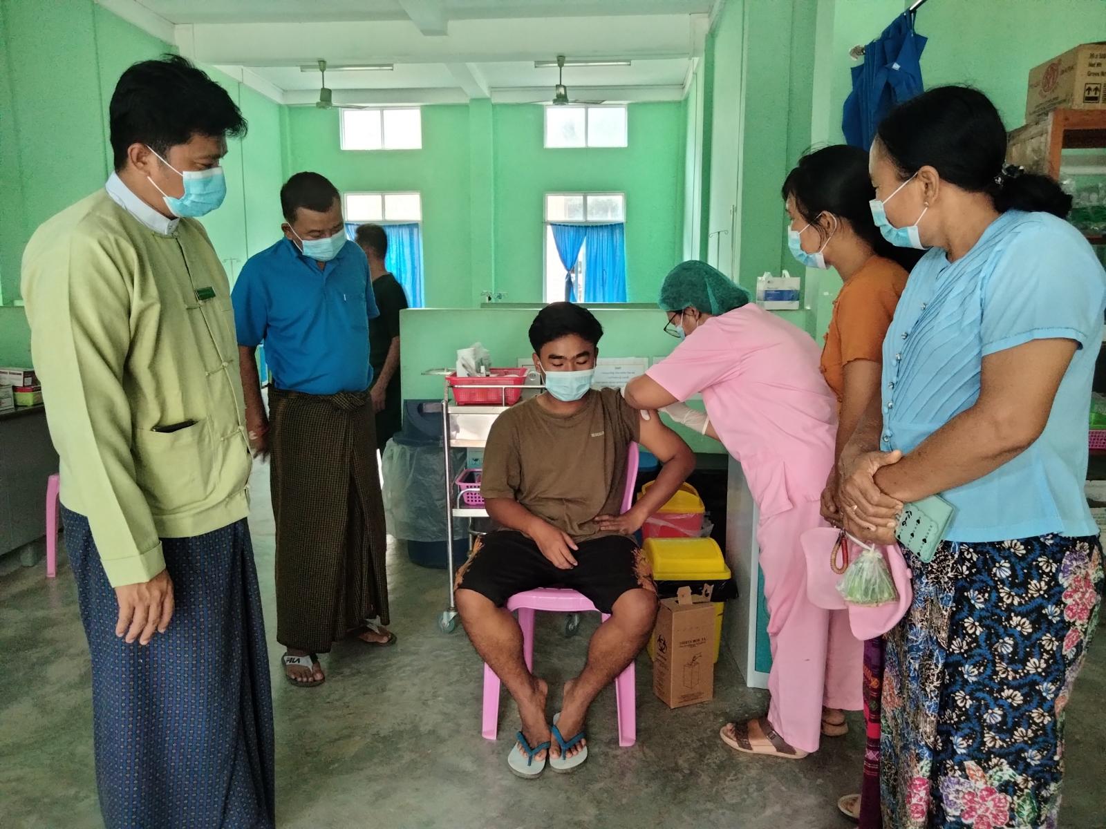ထို့သို့ ကာကွယ်ဆေးထိုးနှံရာတွင် မြို့နယ်ပြည်သူ့ဆေးရုံမှ အထက်တန်းသူနာပြုဆရာမ ဒေါ်နန်းဝန်းကြည်ဦးဆောင်၍ ကျန်းမာရေးဆရာမများ၊ ကျန်းမာရေးဝန်ထမ်းများက ကိုဗစ်-၁၉ ကာကွယ်ဆေး တစ်ကြိမ်တစ်ခါမျှ မထိုးနှံရသေးသော အသက် ၅ နှစ်မှ ၁၂ နှစ်အထိ ကျောင်းသား။၊ ကျောင်းသူများ၊ အသက် ၁၂ နှစ်အထက် ပြည်သူများ၊ ဆရာတော် သံဃာတော်များအား ကိုဗစ်-၁၉ ကာကွယ်ဆေး ပထမအကြိမ်ထိုးနှံပေးခြင်း၊ ပထမအကြိမ်ထိုးနှံပြီးသူများအား ဒုတိယအကြိမ် ထိုးနှံပေးခြင်းနှင့် နှစ်ကြိမ်ထိုးနှံပြီးသူများအား ထပ်ဆောင်းကာကွယ်ဆေး ထိုးနှံပေးခဲ့ပြီး ကာကွယ်ဆေးထိုးနှံပေးနေမှုအား မြို့နယ်ကိုဗစ်-၁၉ထိန်းချုပ်ရေးနှင့် အရေးပေါ်တုန့်ပြန်ရေး ကော်မတီဥက္ကဋ္ဌနှင့် အဖွဲ့ဝင်များက လာရောက်ကြည့်ရှုခဲ့ကြောင်း သိရသည်။