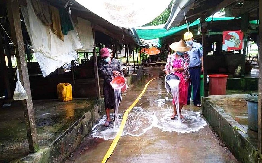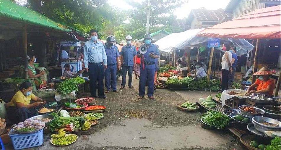 မြို့နယ်စည်ပင်သာယာရေးအဖွဲ့ပိုင်ဈေးတွင် ကျန်းမာရေးနှင့် အားကစားဝန်ကြီးဌာနမှ ထုတ်ပြန်ထားသော စည်းကမ်းချက်များ နှင့်အညီ ကိုဗစ်-၁၉ ရောဂါ ကူးစက်ပြန့်ပွားမှု မရှိစေရေးအတွက် ဈေးရောင်းချသူများနှင့် ဈေးဝယ်ကြသူများတွင် Mask တပ်ဆင် ရောင်းဝယ်မှု ရှိ /မရှိ တို့ကိုနေ့စဉ် စစ်ဆေးလျက်ရှိပြီး နှာခေါင်းစည်း (Mask) တပ်ဆင်မှုမရှိပါက ဒါဏ်တပ်ရိုက်ခြင်းနှင့် ညနေပိုင်းတွင် မြို့နယ်စည်ပင်သာယာရေးအဖွဲ့ပိုင် သားငါးတန်းတွင် ဆပ်ပြာရည်ဖြင့် ရေဆေးခြင်းများ ဆောင်ရွက်လျက်ရှိကြောင်း သိရသည်။