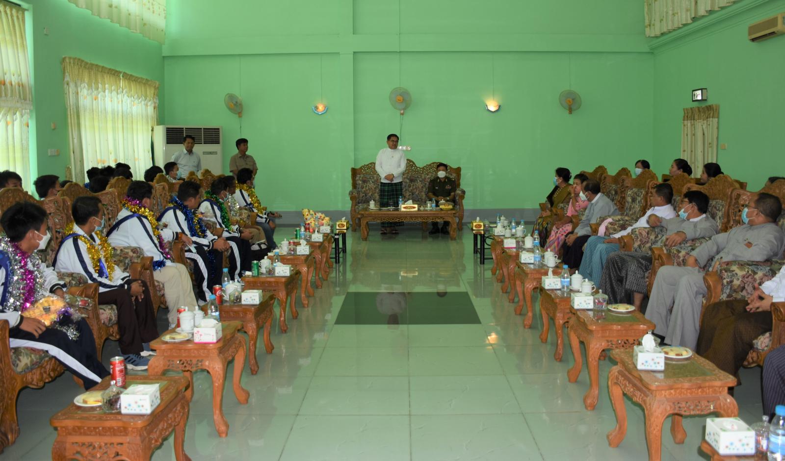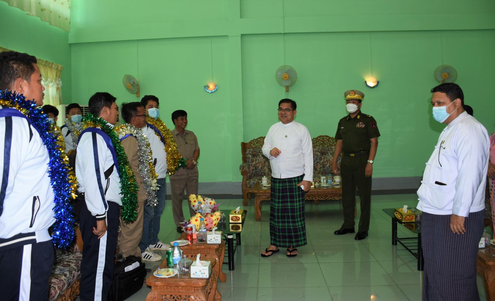ယင်းနောက် လေဆိပ်ဧည့်ခန်းမ၌ ပြည်နယ်ဝန်ကြီးချုပ်က ပြည်နယ်လက်ရွေးစင်ပိုက်ကျော် ခြင်းအသင်း၏ အုပ်ချုပ်သူ၊ နည်းပြများနှင့် အားကစားသမားများအား ပြည်နယ်အတွက် နှစ်ယောက် တွဲပိုက်ကျော်ခြင်းပြိုင်ပွဲတွင် ရွှေတံဆိပ်ဆုထပ်မံရယူခဲ့ကြပြီး ပြည်နယ်ဂုဏ်ကို မြှင့်တင်နိုင်ခဲ့သည့်အတွက် ဝမ်းမြောက်ဂုဏ်ယူပါကြောင်း၊ ဆက်လက်၍လည်း မိမိတို့ရရှိထားသည့် ရွှေတံဆိပ်ဆုကို ထိန်းသိမ်းနိုင်ရန်နှင့် နောင်လာမည့် ပြိုင်ပွဲများအတွက် ကြိုတင်ပြင်ဆင်ထားကြရန် လိုကြောင်း ဂုဏ်ပြုပြောကြားပြီး အုပ်ချုပ်သူတစ်ဦးက ပြိုင်ပွဲအတွေ့အကြုံများကို ရှင်းလင်းတင်ပြကာ ပြည်နယ် ဝန်ကြီးချုပ်နှင့် တိုင်းမှူးတို့က ရင်းရင်းနှီးနှီး နှုတ်ဆက်ဂုဏ်ပြုခဲ့ကြသည်။