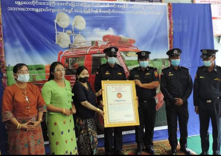 မန္တလေး၊ အောင်မြေသာစံမြို့နယ်၊ မင်းတဲအီကင်းရပ်ကွက်၊ ၁၉လမ်း၊ ၈၈လမ်းနှင့် ၈၉လမ်းကြားရှိ အရန်မီးသတ် စခန်းတွင် ယနေ့နံနက် ၁၀နာရီခန့်က သဘာဝဘေးအန္တရာယ်များ ကျရောက်ပါက မီးသတ်တပ်ဖွဲ့ဝင်များ အသုံးပြုနိုင်ရန်အတွက် ငွေကျပ်သိန်း၁၀၀ တန်ဖိုးရှိ Mazda Bongo အမျိုးစား၊ မီးဆလိုက်ကား လှူဒါန်းခြင်းကို အဆိုပါ အရန်မီးသတ် စခန်းတွင် ပြုလုပ်သည်။