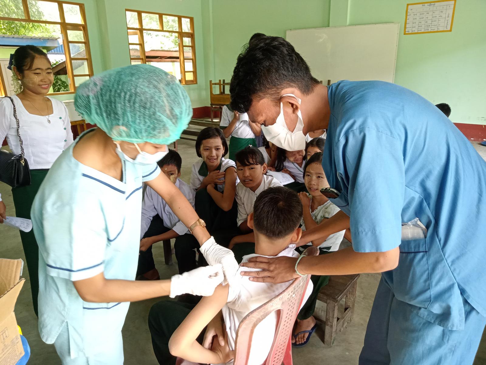 ကာကွယ်ဆေး ထိုးနှံပေးရာတွင် မြို့နယ်သူနာပြုဆရာမကြီး ဦးဆောင်၍ သူနာပြုဆရာမများနှင့် ကျန်းမာရေးဝန်ထမ်းများက အသက် ၅ နှစ်မှ ၁၂ နှစ်အရွယ် ကျောင်းသား၊ ကျောင်းသူလေးများအား ကိုဗစ်-၁၉ ရောဂါ ကာကွယ်ဆေး Sinopharm ဒုတိယအကြိမ် ဆက်လက်ထိုးနှံပေးလျက်ရှိပြီး၊ ကာကွယ်ဆေးထိုးနှံပေးရာသို့ ရပ်ကွက်စီမံအုပ်ချုပ်ရေး အဖွဲ့ဝင်များ၊ ဆရာ၊ ဆရာမများ ကြက်ခြေနီသူနာပြုတပ်ဖွဲ့ဝင်များနှင့် လူမှုရေးပရဟိတအဖွဲ့ဝင်များက ဝိုင်းဝန်းကူညီဆောင်ရွက် ပေးလျက်ရှိသည်။