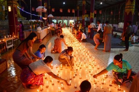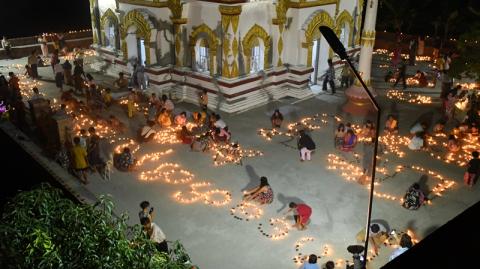 ကြံခင်းမြို့ရှိ ဂေါတမသဗ္ဗညုရွှေပြည်အေး (၁၁) ထပ်ဘုရားကြီး၌ သီတင်းကျွတ်လပြည့် (အဘိဓမ္မာအခါတော်နေ့)တွင် မြို့နယ်အထွေထွေအုပ်ချုပ်ရေးဦးစီး ဌာနမှ ဆီမီး ၁၀၀၀ ထွန်းညှ…