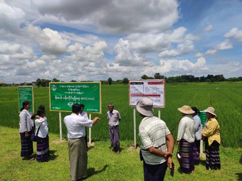 တံတားဦးမြို့နယ် သူငယ်တော်ကျေးရွာတွင် မိုးစပါးပန်းတိုင်အထွက်နှုန်းရရှိရေး ဓာတ်မြေဩဇာနှင့် သဘာဝမြေဩဇာ အချိုးကျ ရောစပ်ကြဲပက်ခြင်း ကွင်းသရုပ်ပြသ