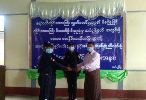 အင်္ဂပူမြို့နယ်တွင်အရန်မီးသတ်တပ်ဖွဲ့များသို့ အပေါ့စားရေစုပ်နှင့် မီးသတ်ဝတ်စုံများပေးအပ်ပွဲပြုလုပ်