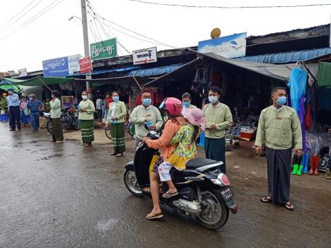ကသာခရိုင်၊ ထီးချိုင့်မြို့စည်ပင်သာယာဈေးတွင် COVID-19 ကူးစက်ပြန့်ပွားမှု့ မဖြစ်ပေါ်စေရေးအတွက် နှာခေါင်းစည်း (Mask)များ အခမဲ့ဖြန့်ဝေ