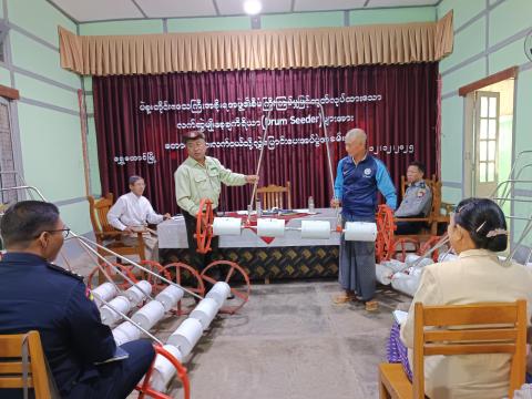 ရွှေတောင်မြို့နယ်တွင် လက်ဆွဲမျိုးစေ့ချကိရိယာ (Drum Seeder) များအား တောင်သူများ လက်ဝယ်သို့ လွှဲပြောင်းပေးအပ်