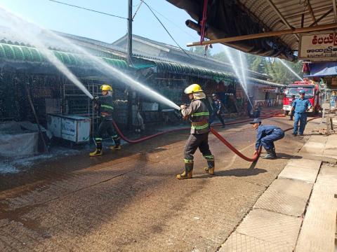 ကျိုက်ထိုမြို့ ပြည်သူ့ဈေးတွင် မီးငြှိမ်းသတ်ရေးနှင့် ရှာဖွေကယ်ဆယ်ရေး ဇာတ်တိုက်လေ့ကျင့်