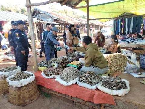 ရွာငံမြို့မဈေးတွင် မီးလောင်/မီးလန့်မှုမဖြစ်ပွားစေရေးနှင့် မီးဘေးကြိုတင်ကာကွယ်ရေး အသိပညာပေးစာစောင်များ ဖြန့်ဝေ