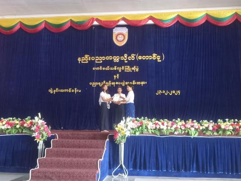 ပဲခူးတိုင်းဒေသကြီး၊ တောင်ငူမြို့နယ်၊ ကေတုမတီမြို့သစ်ရှိ နည်းပညာတက္ကသိုလ်(တောင်ငူ)၌ (၂၀၂၄-၂၀၂၅)ပညာသင်နှစ် ပညာရည်ချွန်ဆုပေးပွဲနှင့် မောင်မယ်သစ်လွင်ကြိုဆိုပွဲအခမ်းအနားကို ယမန်နေ့နံနက်ပိုင်းကကျင်းပရာ ဆရာ၊ ဆရာမများနှင့် ကျောင်းသားကျောင်းသူ(၃၀၀)ဦးခန့် တက်ရောက်သည်။