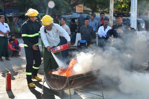 ပြည်မြို့ရှိ စည်ပင်သာယာဈေးများ၌ မီးဘေးကြိုတင်ကာကွယ်ရေး အသိပညာပေး၊ သရုပ်ပြဇာတ်တိုက်လေ့ကျင့်