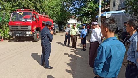 သဲကုန်းမြို့မဈေး၌ မီးဘေးအန္တရာယ်ကြိုတင်ကာကွယ်ရေး မီးငြှိမ်းသတ်ခြင်း လက်တွေ့သရုပ်ပြ