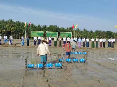 ဖျာပုံမြို့နယ် ကိုးအိမ်တန်းကျေးရွာတွင် မျိုးစေ့ချကိရိယာဖြင့် နွေစပါးမျိုးစေ့ချ စိုက်ပျိုးပွဲကျင်းပ