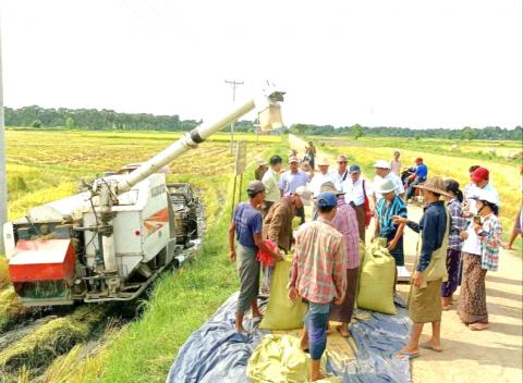 ကွမ်းခြံကုန်းမြို့နယ်တွင်မျိုးစေ့ချကိရိယာ(Seeder)ဖြင့်စိုက်ပျိုးထားသော မိုးစပါးစံကွက်ရိတ်သိမ်း