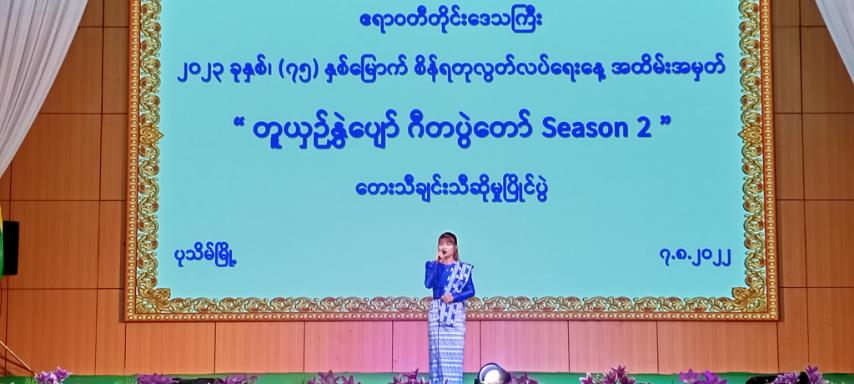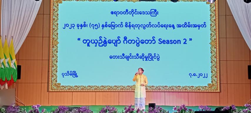 ဧရာဝတီတိုင်းဒေသကြီး၊ ၂၀၂၃ ခုနှစ် (၇၅)နှစ်မြောက် စိန်ရတုလွတ်လပ်ရေးနေ့ အထိမ်းအမှတ် တူယှဉ်နွှဲပျော် ဂီတပွဲတော် Season-2 တေးသီချင်းသီဆိုမှု ပြိုင်ပွဲကို သြဂုတ် ၆ ရက်နေ့ နံနက်ပိုင်းက ပုသိမ်မြို့၊ မြို့တော် ခန်းမ၌ ကျင်းပသည်။