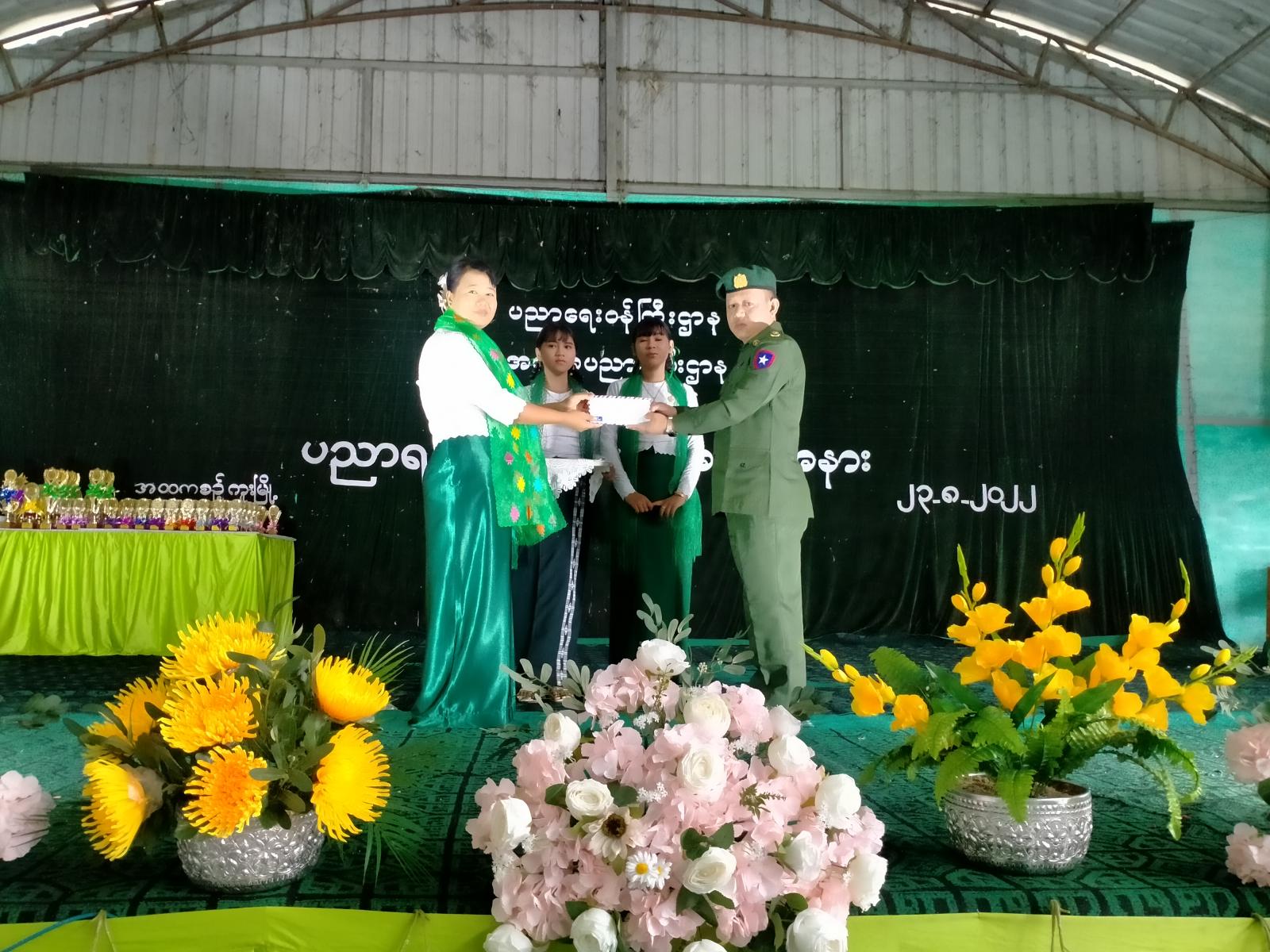 ဆက်လက်၍ မြို့နယ်စီမံအုပ်ချုပ်ရေးအဖွဲ့ဝင်(၁)၊ ဒုတိယမြို့နယ်အုပ်ချုပ်ရေးမှူး ဦးနန်းကိုဦး နှင့် ဒုတိယမြို့နယ်ပညာရေးမှူးတို့က အမှာစကားများ အသီးသီး ပြောကြားခဲ့ပြီး ပညာရည်ချွန်ဆုများကို ချီးမြှင့်ရာ ၂၀၂၁-၂၀၂၂ ပညာသင်နှစ်အတွင်း ထူးချွန်စွာ အောင်မြင်ကြသည့် ကျောင်းသား/ကျောင်းသူများအား မြို့နယ်စီမံအုပ်ချုပ်ရေးအဖွဲ့ အဖွဲ့ဝင်(၁) ဗိုလ်မှူးသော်တာထွန်း၊ အတွင်းရေးမှူး ရဲမှူးဇော်နီချစ်၊ ဒုတိယမြို့နယ်အုပ်ချုပ်ရေးမှူး၊ ကျောင်းအုပ်ဆရာမကြီးနှင့် တာဝန်ရှိသူများက ဆုများအသီးသီး ပေးအပ်ချီးမြှင့်ခဲ့သည်။
