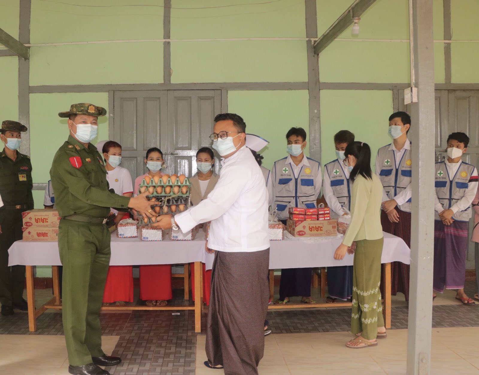 ထိုသို့ ထောက်ပံ့ရာတွင် ဆေးရုံဝန်ထမ်းများအတွက် ကြက်ဥ၊ ဘီစကစ်မုန့်၊ မားမားခေါက်ဆွဲခြောက်များကို ထောက်ပံ့ပေးအပ်ရာ မြို့နယ်ဆရာဝန်ဒေါက်တာ ကျော်ကျော်လင်းက လက်ခံရယူခဲ့ပြီး ပရဟိတအသင်းနှင့် ဘာသာရေးအသင်းအဖွဲ့များအား ဆန်နှင့် အခြေခံစားသောက် ကုန်များ ထောက်ပံ့ပေးအပ်ခဲ့သည်။