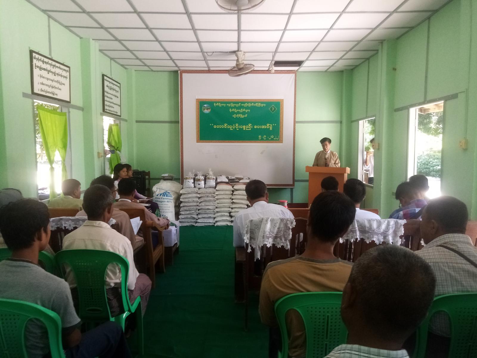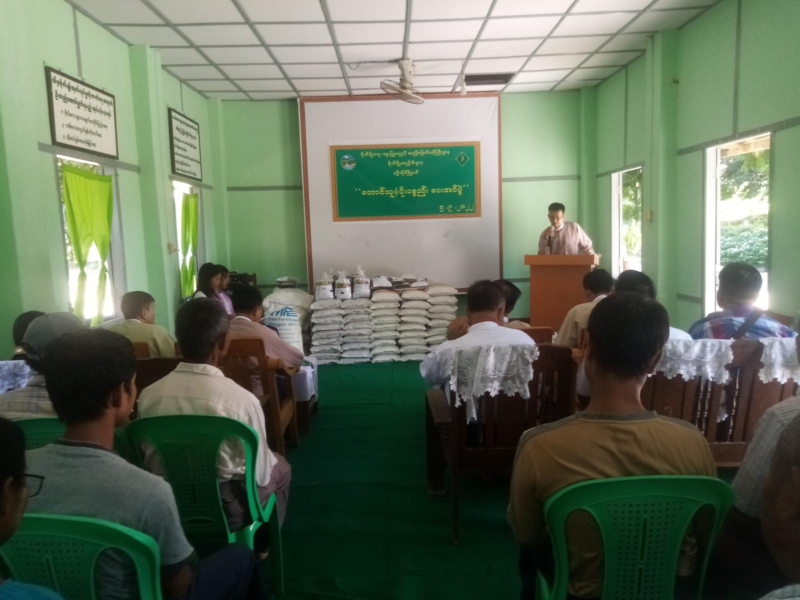 ရှေးဦးစွာ ခရိုင်စီမံအုပ်ချုပ်ရေးအဖွဲ့၊ အဖွဲ့၀င်(၂) ဦးအောင်သူက တောင်သူများအား အရည်အသွေးကောင်းမွန်သည့်မျိုးစေ့များပြန်လည်ရရှိအောင် ကြိုးစားဆောင်ရွက်သွားကြရန် အဖွင့်အမှာစကားပြောကြားခဲ့ပြီး စိုက်ပျိုးရေးဦးစီးဌာန၊ မြို့နယ်ဦးစီးမှူးဦးသန်းဇော်က မိုးနှောင်းဝါမျိုးစေ့နှင့် အိန္ဒိယဆောင်းနေကြာမျိုးစေ့ ထောက်ပံ့ပေးအပ်ရခြင်း ရည်ရွယ်ချက်များကို ရှင်းလင်းပြောကြားခဲ့သည်။