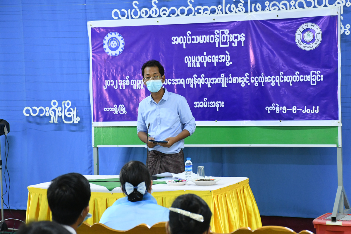 အခမ်းအနားတွင် ရှမ်းပြည်နယ် လူမှုဖူလုံရေးအဖွဲ့ ပြည်နယ်တာဝန်ခံ ဒုတိယညွှန်ကြားရေးမှူး ဒေါ်သန္တာဝင်းမှ လူမှုဖူလုံရေးသမိုင်းကြောင်းနှင့် ၂၀၁၂ခုနှစ် လူမှုဖူလုံရေး ဥပဒေပါ ခံစားခွင့်များအကြောင်း ရှင်းလင်းပြောကြားခဲ့ပြီး ခရိုင်လျှပ်စစ်အင်ဂျင်နီယာရုံးမှ အာမခံအလုပ်သမား ဦးအောင်ဇော်မိုး၏ အလုပ်ခွင် ပြင်ပထိခိုက်သေဆုံးမှုအတွက် ကျန်ရစ်သူအကျိုးခံစားခွင့် ခွင့်ပြုငွေကျပ်သိန်း(၉၀)ကို ၎င်း၏ ဖခင်ဖြစ်သူ ဦးလှမိုးအား လည်းကောင်း၊ အာမခံအလုပ်သမား ဦးဌေးလွင်၏ မကျန်းမာမှုအကျိုးခံစားခွင့် ငွေကျပ် (၁၁၅၂၀ဝိ/)ကို လည်းကောင်း ပေးအပ်ခဲ့သည်။