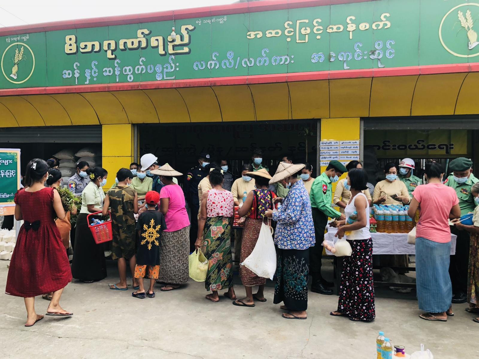 ထို့သို့ရောင်းချပေးရာတွင် ဓနုဖြူမြို့နယ် စီမံအုပ်ချုပ်ရေးအဖွဲ့မှ ဦးဆောင်၍ မြို့နယ်အထွေထွေအုပ်ချုပ်ရေး ဦးစီးဌာန၊ ခမရ (၁၀၈)၊ မြို့နယ်ရဲတပ်ဖွဲ့ဝင်များ၊ ရပ်ကွက်အုပ်ချုပ်ရေးမှူးများ၊ မြို့နယ်ဆန်စက်လုပ်ငန်းရှင်များ အသင်းနှင့် မိဘဂုဏ်ရည်ဆန်စက်မိသားစုတို့မှ ဆန်(၁)ပြည်လျှင် (၁၅၀၀)ကျပ်၊ ဆီ (၅၀)ကျပ်သားလျှင် (၂၅၀၀)ကျပ်၊ ကြက်ဥ (၆) လုံးလျှင် (၁၀၀၀) ကျပ်၊ အိုင်အိုဒင်းဆား (၁)ထုပ်လျှင် (၂၀၀)ကျပ်နှုန်းနှင့် တပ်မတော်စက်ရုံမှ ထုတ်လုပ်သောပစ္စည်းများအား ဓနုဖြူမြို့နယ်အတွင်းရှိ လူဦးရေ (၆၀၀)ခန့်အား စျေးနှုန်း ချိုသာစွာဖြင့် ရောင်းချပေးခဲ့ကြောင်း သိရသည်။
