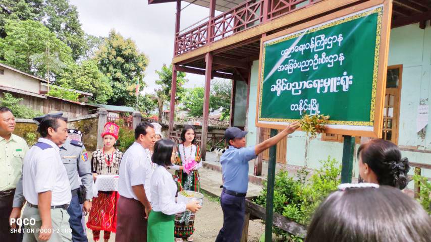 ဆိုင်းဘုတ်သစ်တင်ပွဲ အခမ်းအနားကို မြို့နယ်စီမံအုပ်ချုပ်ရေးအဖွဲ့ဥက္ကဋ္ဌ ဦးအောင်စိုး၊ မြို့နယ်စီမံအုပ်ချုပ်ရေး အဖွဲ့ အတွင်းရေးမှူး ရဲမှူးသက်နိုင်ဦး၊ မြို့နယ်စီမံအုပ်ချုပ်ရေး အဖွဲ့ဝင် ဦးဇော်လွမ်းတူး၊ မြို့နယ်ပညာရေးမှူး ဒေါ်ရွှေနယ်ဇိန်းနှင့် မြို့နယ်အဆင့်ဌာန ဆိုင်ရာ တာဝန်ရှိသူများက တက်ရောက်ဖွင့်လှစ်ပေးခဲ့ကြသည်။
