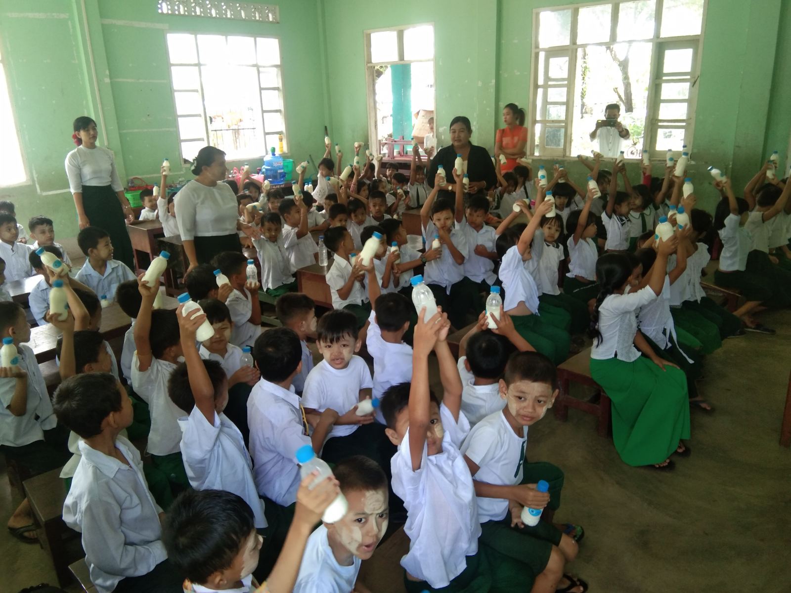 ထို့နောက် ကျောင်းသား၊ ကျောင်းသူများအား အာဟာရပြည့်နွားနို့ တိုက်ကျွေးခြင်း အစီအစဉ်ပြုလုပ်ရာ မွေးမြူရေးနှင့်ကူသရေးဦးစီးဌာနမှ ဝန်ထမ်းများက K.G တန်းမှ Grade – 2 အထိ ကျောင်းသား၊ ကျောင်းသူ ၂၅၀ ဦးတို့အား နွားနို့ဘူးများကို ဝေငှခဲ့ကြကြောင်း သိရသည်။