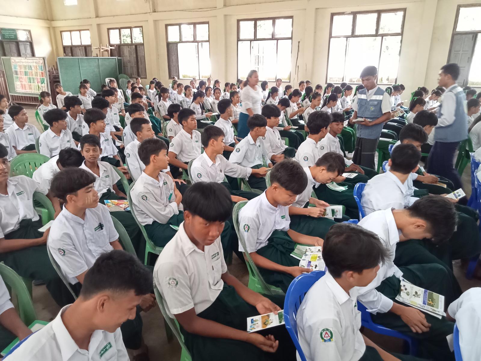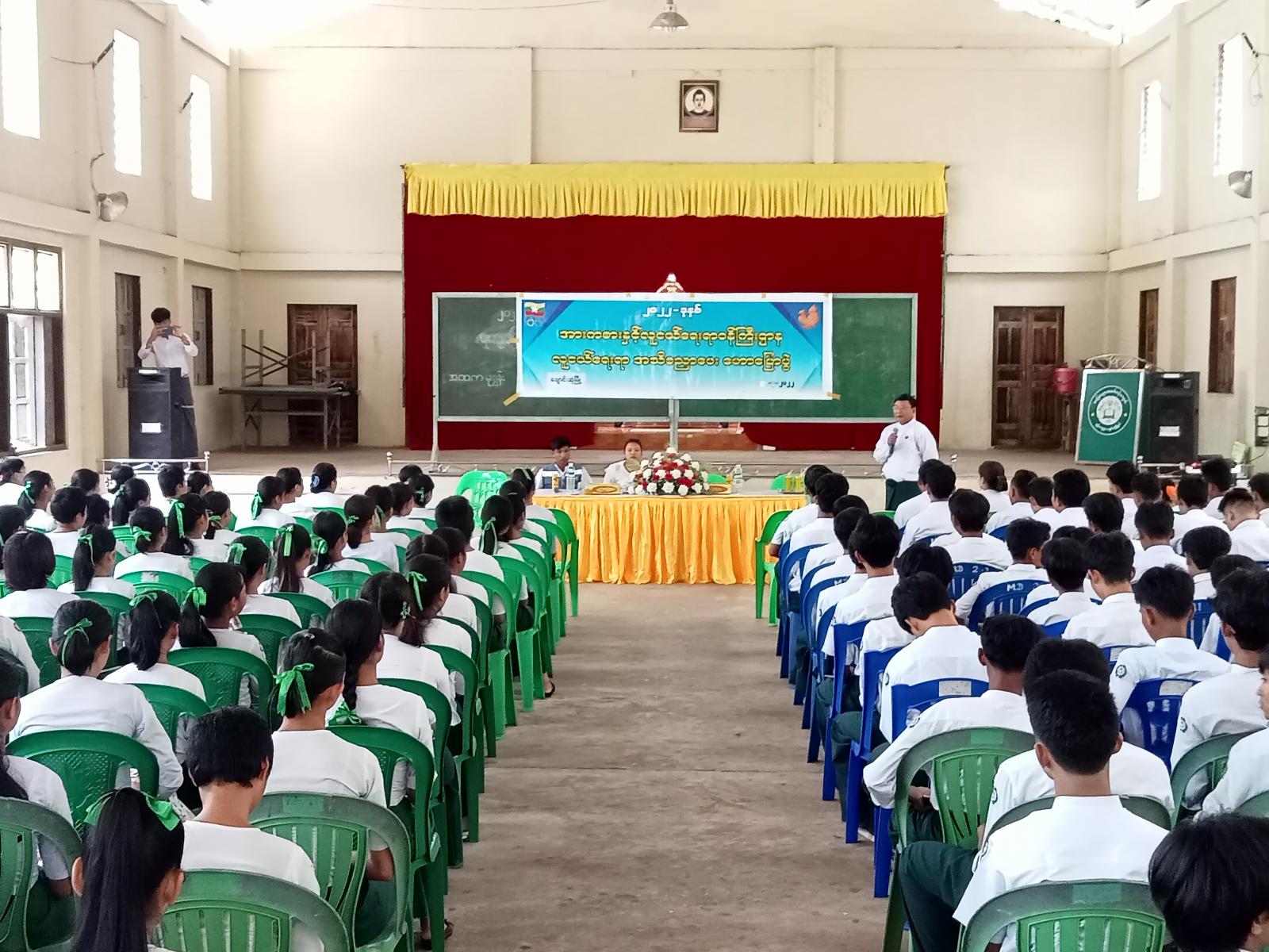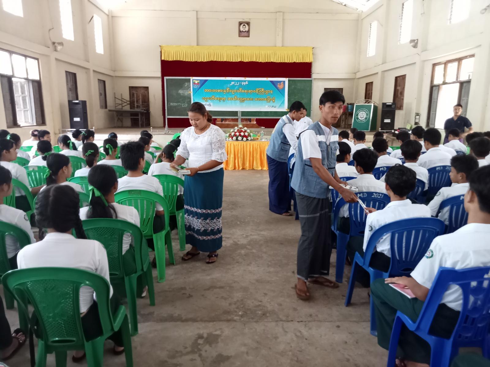 ထို့နောက် (အား/ကာ)ဌာနမှ အားကစားပစ္စည်းများနှင့် (ဘေး/စီမံ)ဌာနမှ သဘာဝဘေးနှင့် ပတ်သက်ပြီး ဗီနိုင်းပိုစတာနှင့် လက်ကမ်းစာစောင်များ ပေးအပ်ရာ ကျောင်းအုပ်ဆရာကြီးက လက်ခံရယူပြီး ကျောင်းသား/ သူများအား အဆိုပါအဖွဲ့မှ လက်ကမ်းစာစောင်များ ဖြန့်ဝေပေးခဲ့ကြောင်းနှင့် ဟောပြောပွဲတွင် ဆရာ/ ဆရာမနှင့် ကျောင်းသား/ သူ (၃၂၀)ဦး တက်ရောက်ခဲ့ကြောင်း သိရသည်။