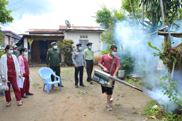 ယင်းနောက် အမှတ်(၁၀)ရပ်ကွက်အတွင်း၌ မြို့နယ်ပြည်သူ့ကျန်းမာရေးနှင့်ကုသရေးဦးစီးဌာနမှူး ဒေါက်တာရီရီထွေးနှင့် ကျန်းမာရေးဝန်ထမ်းများ ဆောင်ရွက်နေသည့် သွေးလွန်တုပ်ကွေးရောဂါ ကာကွယ်ရေးအတွက် အဘိတ်ဆေးခတ်ခြင်းနှင့် ခြင်ဆေးဖျန်းခြင်းလုပ်ငန်းတို့ကို ကြည့်ရှုအားပေးကာ လိုအပ်သည်များကို ပေါင်းစပ်ညှိနှိုင်း ဆောင်ရွက်ပေးခဲ့ကြောင်း သိရသည်။