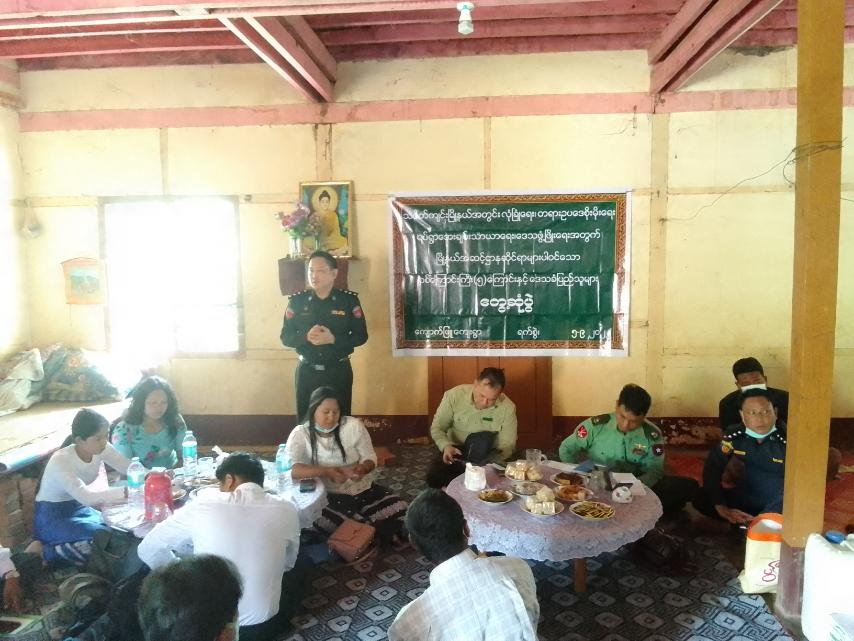 ထိုသို့ ကွင်းဆင်းတွေ့ဆုံရာတွင် မြိုနယ်စီမံအုပ်ချုပ်ရေးအဖွဲ့ဥက္ကဋ္ဌ ဦးသန်းထိုက်အောင်က လုံခြုံရေး၊ တရားဥပဒေစိုးမိုးရေး၊ ရပ်ရွာအေးချမ်းသာယာရေး၊ ဒေသဖွံဖြိုးတိုးတက်ရေး လုပ်ငန်းများဆောင်ရွက်နေမှုနှင့် ဌာနဆိုင်ရာကဏ္ဍများအလိုက် ပြည်သူ့ဝန်ဆောင်မှု လုပ် ငန်းများ ဆောင်ရွက်ပေးနေမှုအခြေအနေများကို ရှင်းလင်းပြောကြားခဲ့ပြီး အဖွဲ့ဝင်(၁)ဗိုလ်မှူး ဝင်းမြတ်သူက မြို့နယ်အတွင်း အကြမ်းဖက်လုပ်ဆောင်မှုဖြစ်စဥ်များအား ရှင်းလင်းပြောကြားခဲ့ကာ ဌာနဆိုင်ရာတာဝန်ရှိသူများမှ ပညာရေး၊ကျန်းမာရေး၊လမ်းပန်းဆက်သွယ်ရေး၊ စိုက်ပျိုးရေး၊ လျှပ်စစ်ကဏ္ဍ၊ စိုက်ပျိုးမြေ၊ မီးဘေးလုံခြုံရေး၊ လမ်းတံတားကောင်းမွန်ရေးတို့ကို ဌာနတာဝန်ရှိသူများမှ ဆောင်ရွက်ပေးနိုင်မှုတို့ကို ရှင်းလင်းဆွေးနွေးခဲ့ပြီး တက်ရောက်လာသည့်ဒေသခံပြည်သူများမှ မိမိတို့ ရပ်ရွာဒေသဖွံဖြိုးရေးတိုးတက်အတွက် ဆောင်ရွက်လိုသည့် လုပ်ငန်းများနှင့်ပတ်သက်ပြီး မေးမြန်ဆွေးနွေးရာ မြို့နယ်စီမံအုပ်ချုပ်ရေးအဖွဲ့ဥက္ကဋ္ဌနှင့် ဌာနဆိုင်ရာတာဝန်ရှိသူများမှ ပြန်လည်ဖြေရှင်း ဖြည့်စည်းဆောင်ရွက်ပေးခဲ့ကြောင်း သိရ သည်။