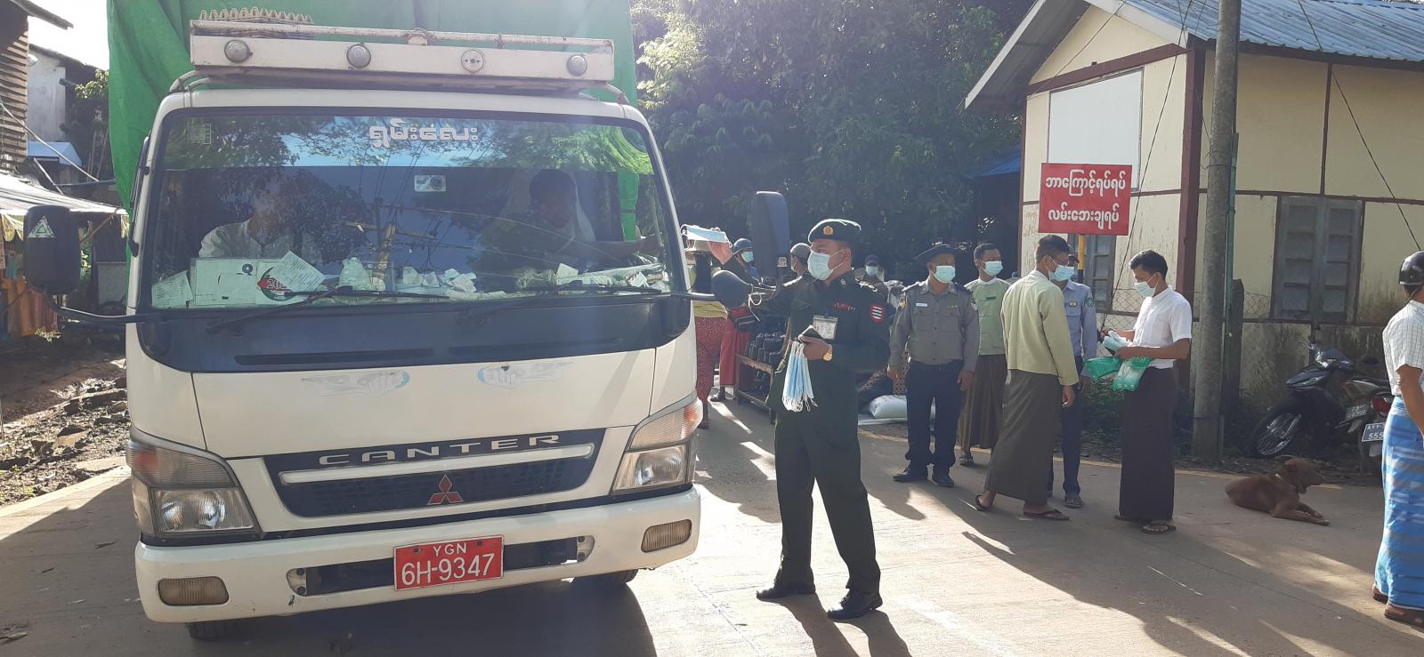 Mask များ အခမဲ့ဖြန့်ဝေခြင်းအား မြို့နယ်စီမံအုပ်ချုပ်ရေးအဖွဲ့ ဥက္ကဋ္ဌဦးမင်းဧရာထိုက်နှင့် အဖွဲ့ဝင်များ၊ ကိုဗစ်-၁၉ ရောဂါ ထိန်းချုပ်ရေးနှင့်အရေးပေါ် တုန့်ပြန်ရေးကော်မတီ အဖွဲ့၀င်တို့က ပြည်သူများအားနေအိမ်ပြင်ပသို့ ထွက်ခွာသွားလာပါက မဖြစ်မနေ စနစ်တကျ Mask တပ်ဆင်သွားရန်နှင့်ကျန်းမာရေးနှင့်အားကစားဝန်ကြီးဌာနမှ ထုတ်ပြန် ထားသော စည်းကမ်းချက်များနှင့်အညီ လိုက်နာဆောင်ရွက်သွားလာကြရန် အသိပညာပေး နှိုးဆော်တိုက်တွန်း ပြောကြားပြီး Mask တပ်ဆင်လာခြင်းမရှိသော ပြည်သူများအား Mask များ အခမဲ့ဖြန့်ဝေတပ်ဆင်ပေးခဲ့ကြကြောင်း သိရသည်။