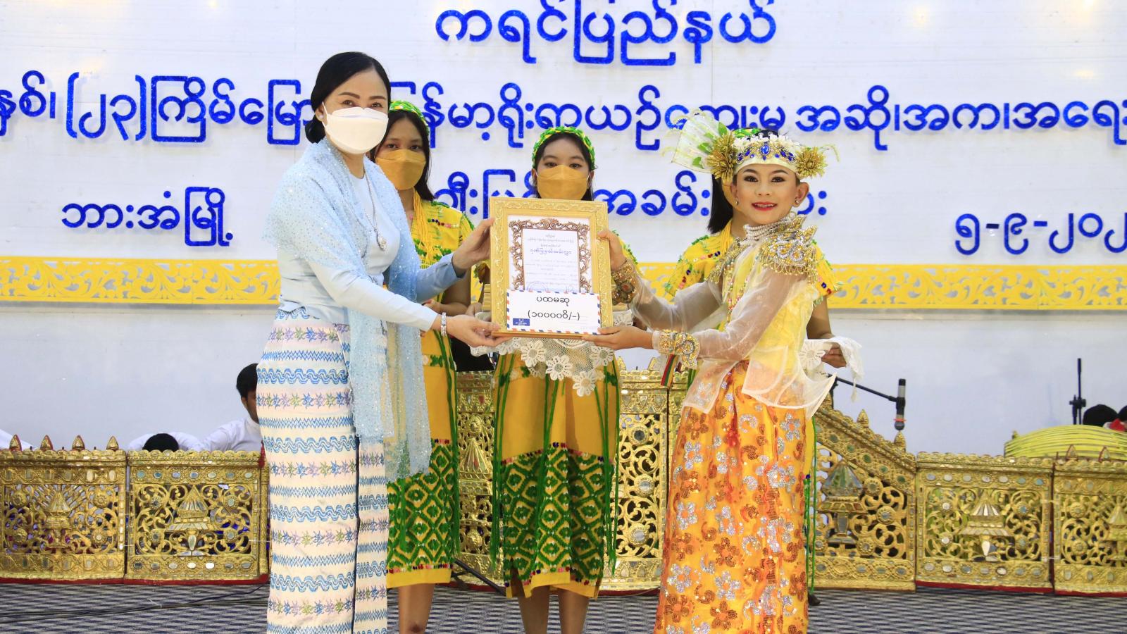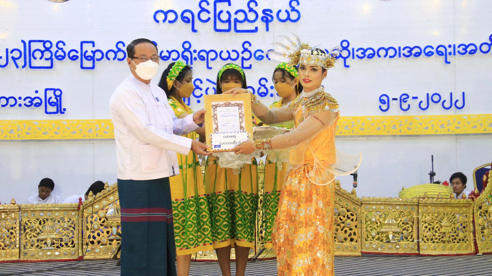 ဆုချီးမြှင့်ပွဲတွင် ကရင်ပြည်နယ်ဝန်ကြီးချုပ်ဦးစောမြင့်ဦးက မွန်ယိမ်းအက၊ ကဗျာလွတ်အက၊ အခြေခံပညာ (၁၅-၂၀)နှစ် အမျိုးသားအက၊ အမျိုးသမီးအက၊ အဆင့်မြင့်ပညာအမျိုးသားအက ပြိုင်ပွဲတို့တွင် ပထမဆုရရှိသူများ အားလည်းကောင်း၊ ပြည်နယ်ဝန်ကြီးချုပ်၏ ဇနီး ဒေါ်နန်းဘေဘီမြင့်က ဝါသနာရှင်ဒုတိယတန်းအမျိုးသားအက၊ အခြေခံပညာ(၁၀-၁၅)နှစ် အမျိုးသားအက၊ အမျိုးသမီးအက၊ခေတ်ဟောင်းကာလပေါ်(အဆို)ပြိုင်ပွဲတို့တွင် ပထမဆု ရရှိသူများကိုလည်းကောင်း၊ ပြည်နယ်တရားလွှတ်တော်တရားသူကြီးချုပ်ဒေါ်ခင်ဆွေထွန်းက အခြေခံပညာ(၁၀-၁၅)နှစ် အမျိုးသား/အမျိုးသမီး ခေတ်ဟောင်းကာလပေါ်(အဆို)၊ မဟာဂီတပြိုင်ပွဲတို့တွင် ပထမဆုရရှိသူများကို လည်းကောင်း၊ ပြည်နယ်အစိုးရအဖွဲ့ဝင်များနှင့် ၎င်းတို့၏ဇနီးများက ပြိုင်ပွဲတွင် ဒုတိယ၊ တတိယ၊ အထူးဆုနှင့် နှစ်သိမ့်ဆုရရှိသူများကိုလည်းကောင်း အသီးသီး ဆုများပေးအပ်ချီးမြှင့်ခဲ့ပြီး ကရင်ပြည်နယ် မြန်မာ့ရိုးရာယဉ်ကျေးမှု အဆို၊ အက၊ အရေး၊ အတီး ပြိုင်ပွဲကျင်းပရေးကော်မတီဥက္ကဋ္ဌ တိုင်းရင်းသားရေးရာဝန်ကြီးဦးစန်းကိုက ဒိုင်အဖွဲ့နှင့် အတီးပံ့ပိုးအဖွဲ့ဝင်များအား ဂုဏ်ပြုဆုများပေးအပ်ချီးမြှင့်သည်။