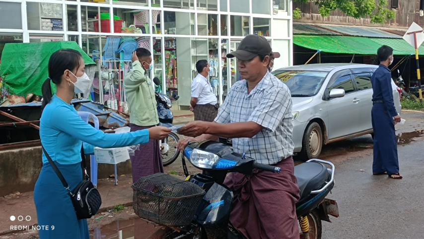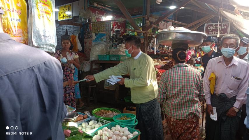 ထို့သို့ Mask Campaign ပြုလုပ်ရာတွင် မြို့နယ်စီမံအုပ်ချုပ်ရေးအဖွဲ့ ဒုတိယမြို့နယ် အုပ်ချုပ်ရေးမှူး ဦးမျိုးနိုင်နှင့် အဖွဲ့ဝင်များ၊ မြို့နယ်ကျန်းမာရေးဦးစီးဌာနမှ ဝန်ထမ်းများ၊ မြို့နယ်စည်ပင်သာယာရေး အမှုဆောင်အရာရှိနှင့် ဝန်ထမ်းများ၊ မြို့နယ်ရဲတပ်ဖွဲ့ဝင်များ၊ မီးသတ်တပ်ဖွဲ့ဝင်များ၊ ဌာနဆိုင်ရာများ၊ ဈေးကော်မတီဝင်များ ပူးပေါင်း၍ ကိုဗစ်-၁၉ ရောဂါ ညွှန်ကြားချက်များ၊ နည်းလမ်းများ၊ စည်းကမ်းချက်များအား ဈေးအတွင်/အပြင် ခရီးသွားပြည်သူများအား အပြင်ထွက်တိုင်း Mask စနစ်တကျ တပ်ဆင်ပြီး အရောင်းအဝယ် ပြုလုပ်ရန်၊ ခရီးသွားလာကြရန် အသိပညာပေး ပြောကြားကာ Mask များ အခမဲ့ဖြန့်ခဲ့ကြောင်း သိရသည်။